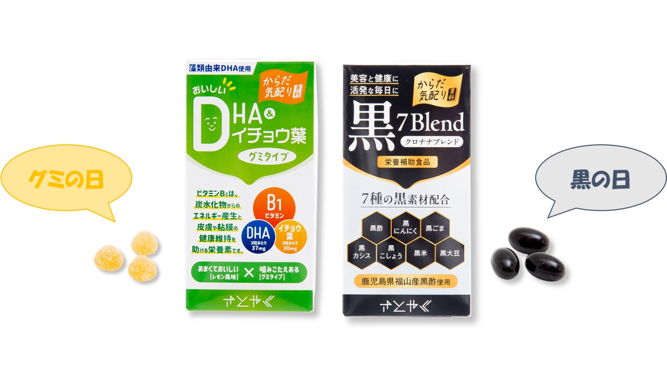 例年話題になる9月3日の「グミの日」と9月6日の「黒の日」に、それぞれの記念日にちなんだ商品の1日限定キャンペーンを実施します。9月3日の「グミの日」には、からだ気配り専科シリーズの「おいしいDHA&イチョウ葉 グミタイプ」、9月6日の「黒の日」には、からだ気配り専科シリーズの「黒7ブレンド」を特別価格で販売します。