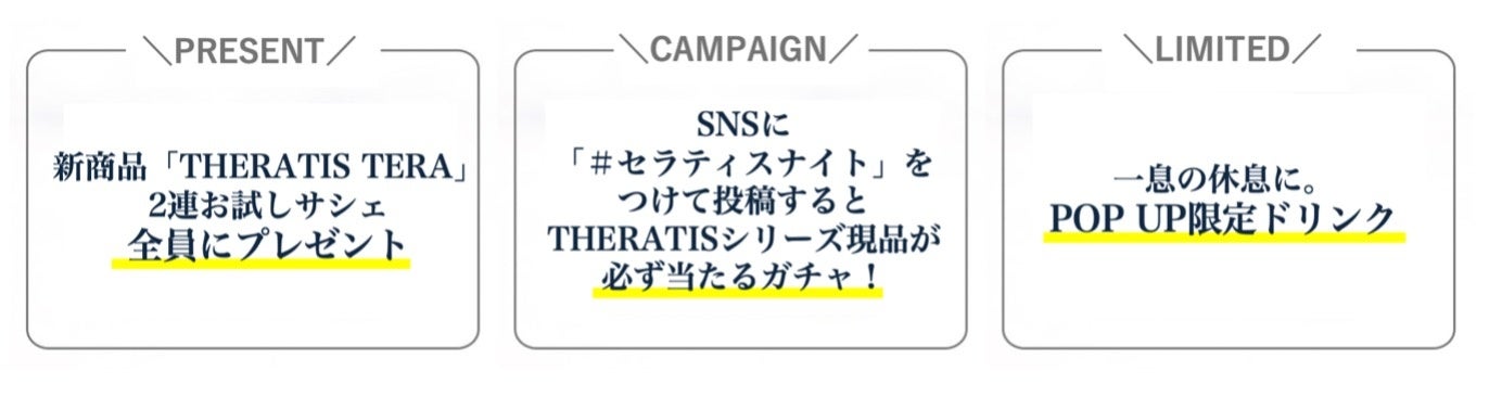 ご来場いただいた皆さまに、新ライン「THERATIS TERA」のお試しパウチを無料プレゼント。また、SNSアカウントのフォローなど条件をクリアすると、THERATISシリーズ現品が当たるTHERATIS Premiumガチャやオリジナルドリンクもお楽しみいただけます。