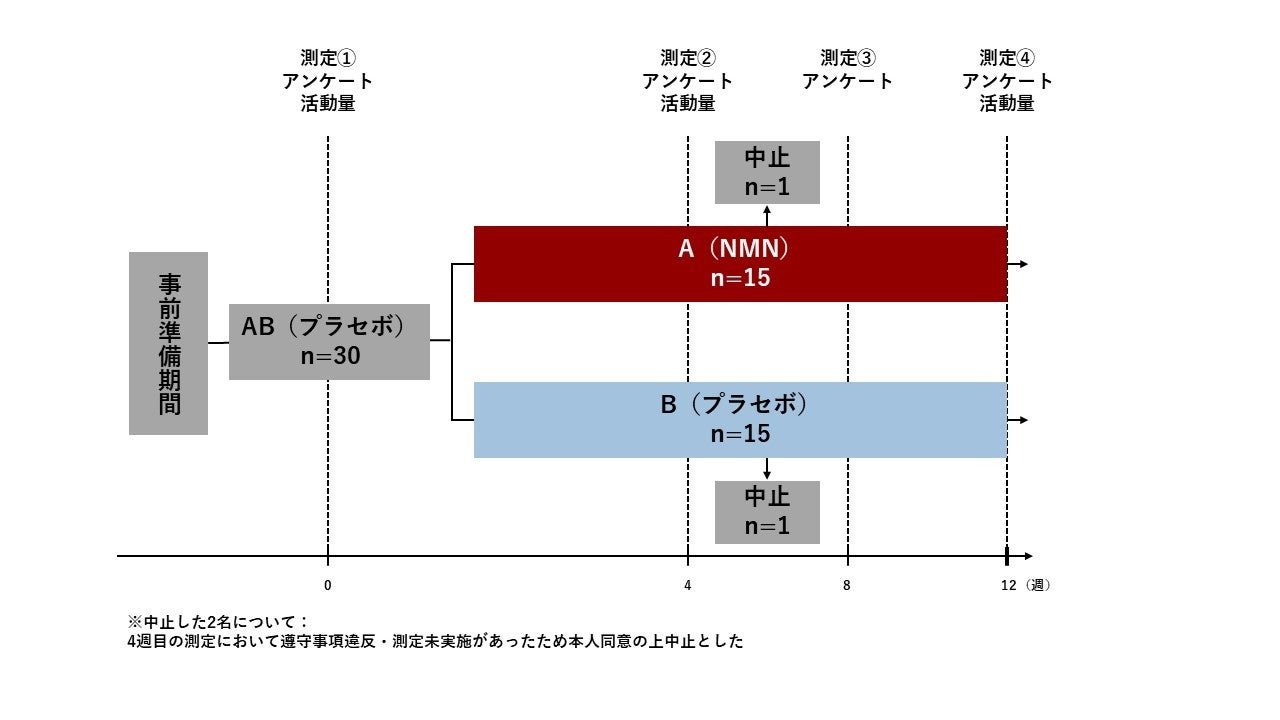 方法:12週間、「NMNを摂取する群」と「プラセボ薬を摂取する群」に15名ずつランダムに振り分けて2群間の比較を実施(研究フロー図を参照)