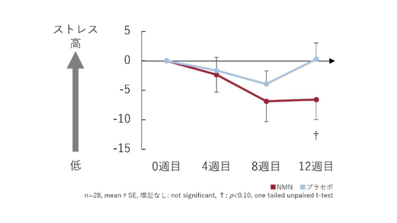 結果②:NMN摂取群はプラセボ群に比べて、ストレスが摂取12週目から改善する傾向