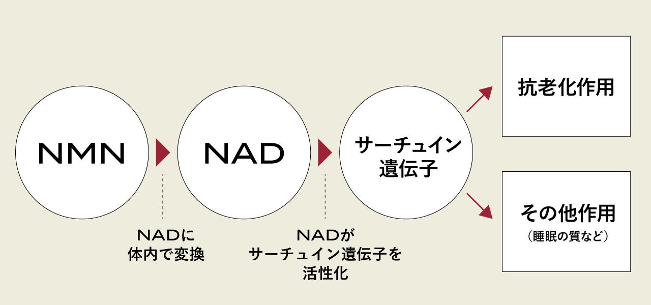 近年、健康的で自立した人生を送るために“若々しいエネルギーを維持”することが重要視される中、NMNが世界中の研究者から注目を集めています。NMNはビタミンB3の一種であり、体内で生成される物質ですが、加齢とともにその生成量が減少します。これまでの研究で、NMNは体内で代謝やエネルギー作りに必要な栄養素であるNAD(ニコチンアミドアデニンジヌクレオチド)に変換されることで、抗老化遺伝子とも呼ばれるサーチュイン遺伝子を活性化することが報告されています。このサーチュイン遺伝子が活性化することで、生体内で発生する老化プロセスを調節する効果が期待されています。