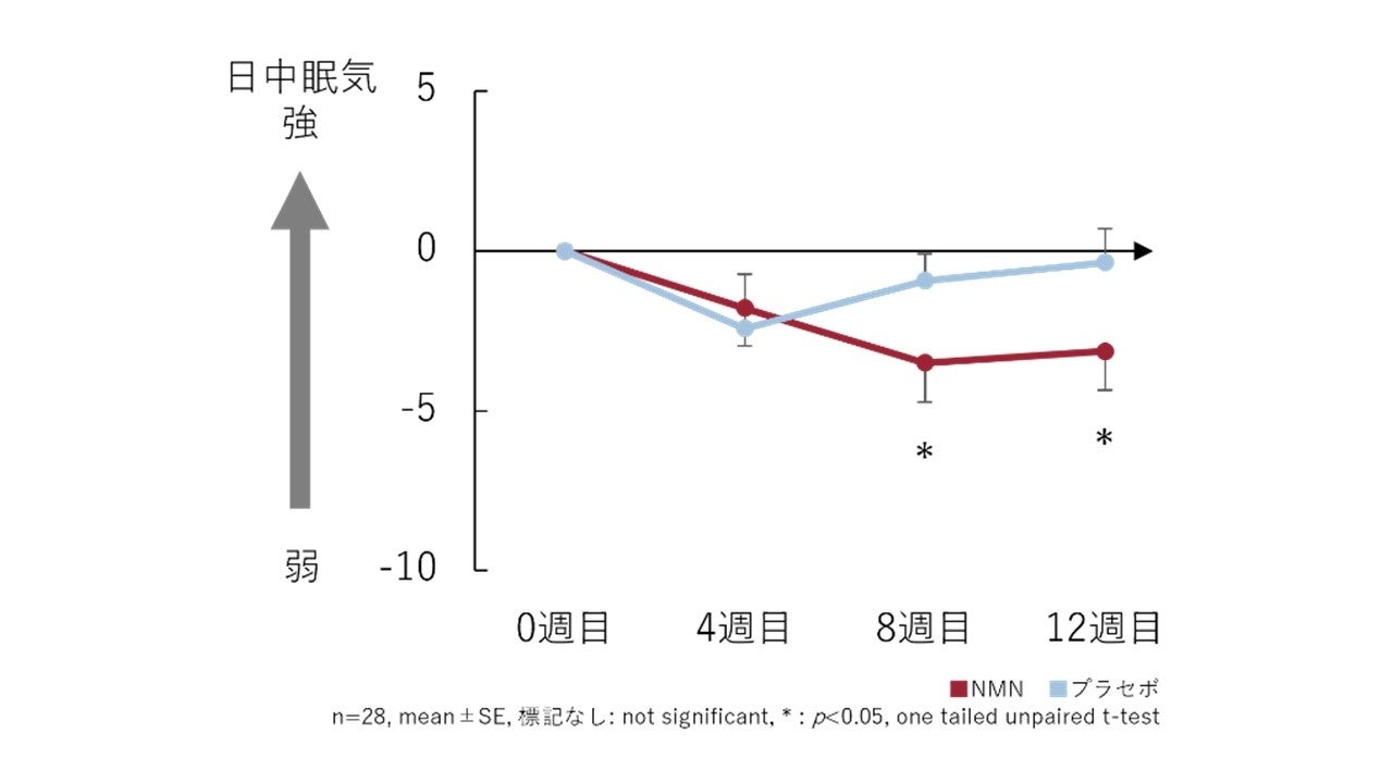 ESSの結果から、NMN摂取群はプラセボ群に比べて日中の眠気が8週目から改善する傾向が確認されました。