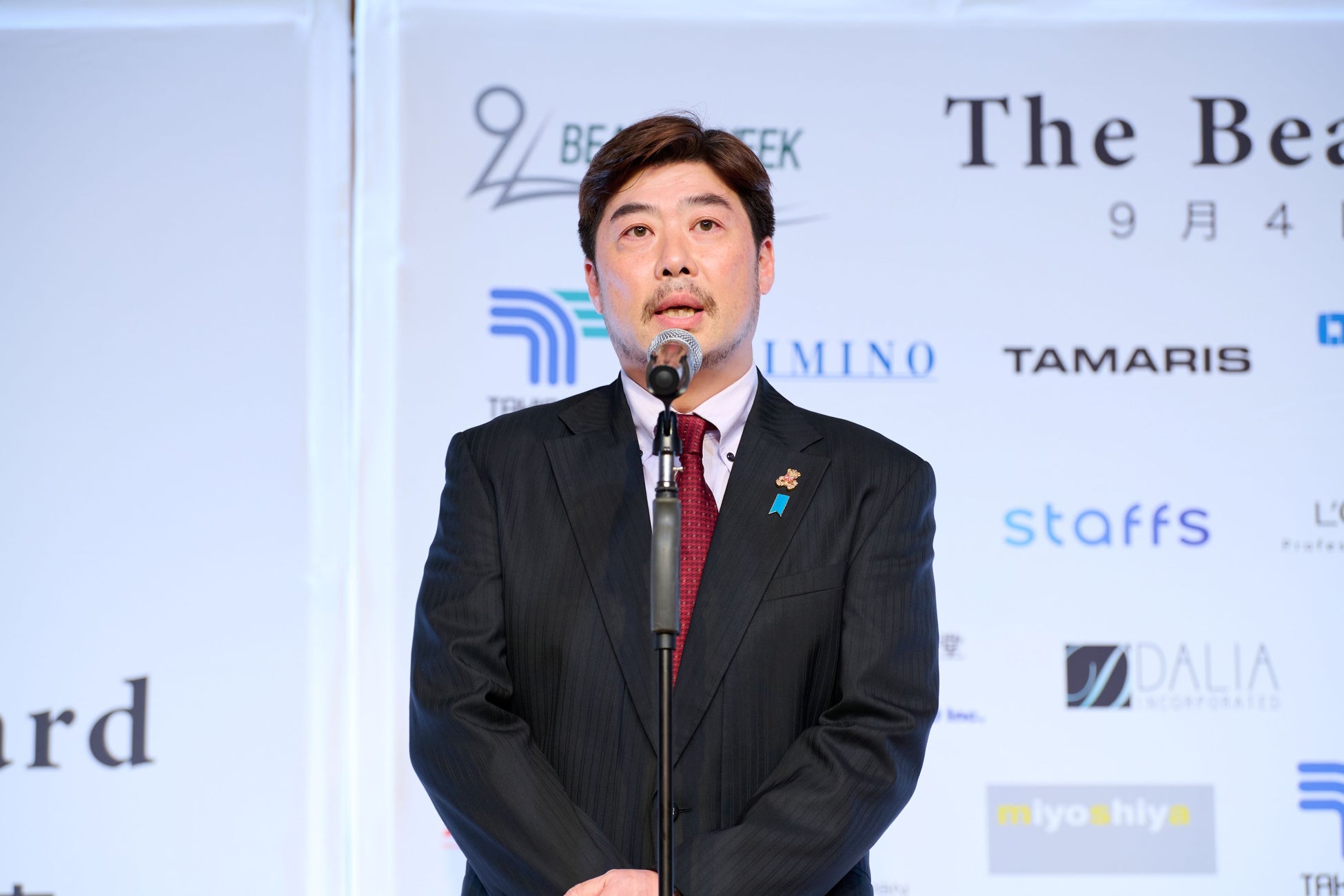 2024年のテーマは「HIGH QUALITY EDUCATION FOR ALL」。実行委員長の枝村仁より「全国でカットを教えています。美容師への良い教育を広げていきたいです。今後は一人の教育者として教育できる人も育てていきたいと思っています。美容の役割は広くなってきています。美容師の幅を広げていきたいです。」と全国美容週間振興協議会としてSDGs(特に育成)に意識をもっていくことの重要性を訴えました。