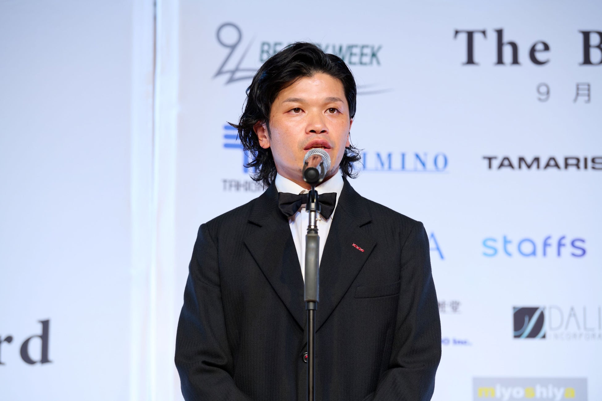 井手上漠さんは、「美やビューティーは大好きな言葉です。私は、小学4年生で美容に目覚めました。カットウイッグを母に買ってもらい、それを使ってヘアアレンジをやっていました。髪は武器になります。賞をもらいヘアケア頑張ってきてよかったなと思いました。この賞に見合うように自分を高めていきたいです。」とコメント。「髪は摩擦がいけないと教えてもらいました。寝相が悪いので寝るときはナイトキャップで髪を保護しています。」と最近のヘアケアを紹介しました。