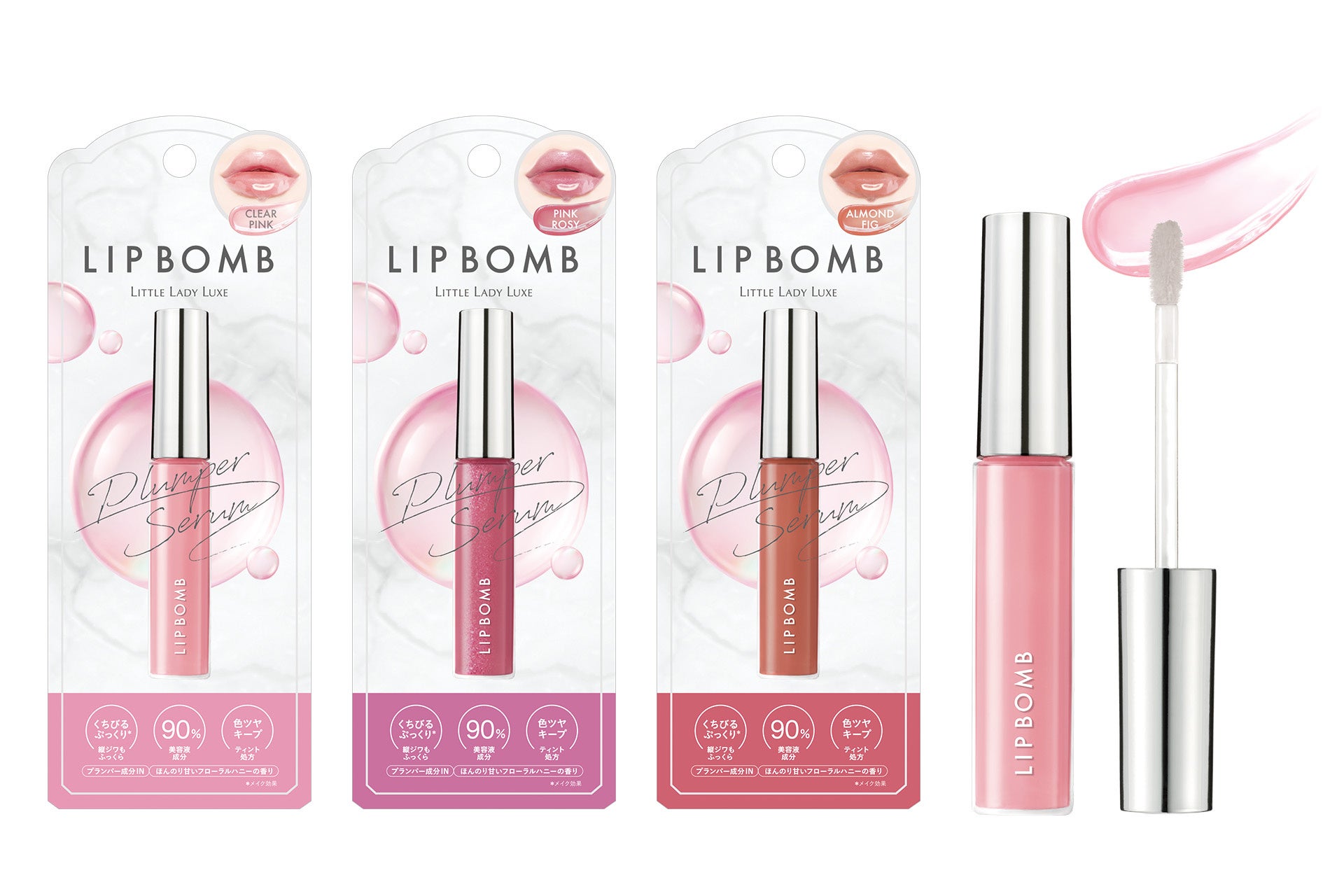 リップボム プランパーセラム <リップグロス> 左から 01 クリアピンク、02 ピンクロージー、03 アーモンドフィグ