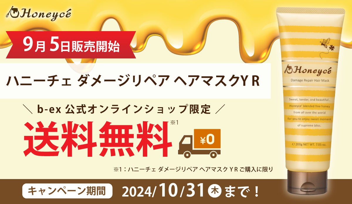 本日9月5日(木)から10月31日(木)までの期間、b-ex公式オンラインショップにて「ハニーチェ ダメージリペアヘアマスクY R」をお買い上げいただくと送料無料にてお届けいたします。お試ししやすいこの機会にぜひお買い求めください。