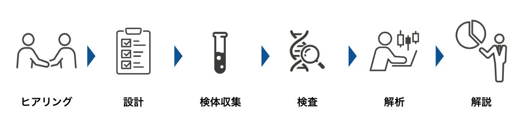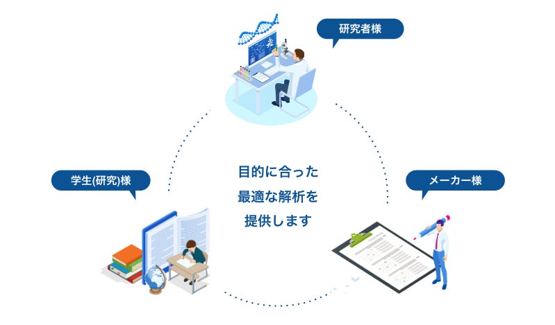当社では、自社LAB・解析研究員、検査研究員をワンストップで抱えるからこそ、言われたことをやる単なる解析業務の外注作業ということではなく、お客様のやりたいことに寄り添った、成果伴走型の解析サービスのスタートに踏み切りました。ご利用になる目的に合わせて、解析方法の選択や検体数などの設計から解説まで一括サポートいたします。