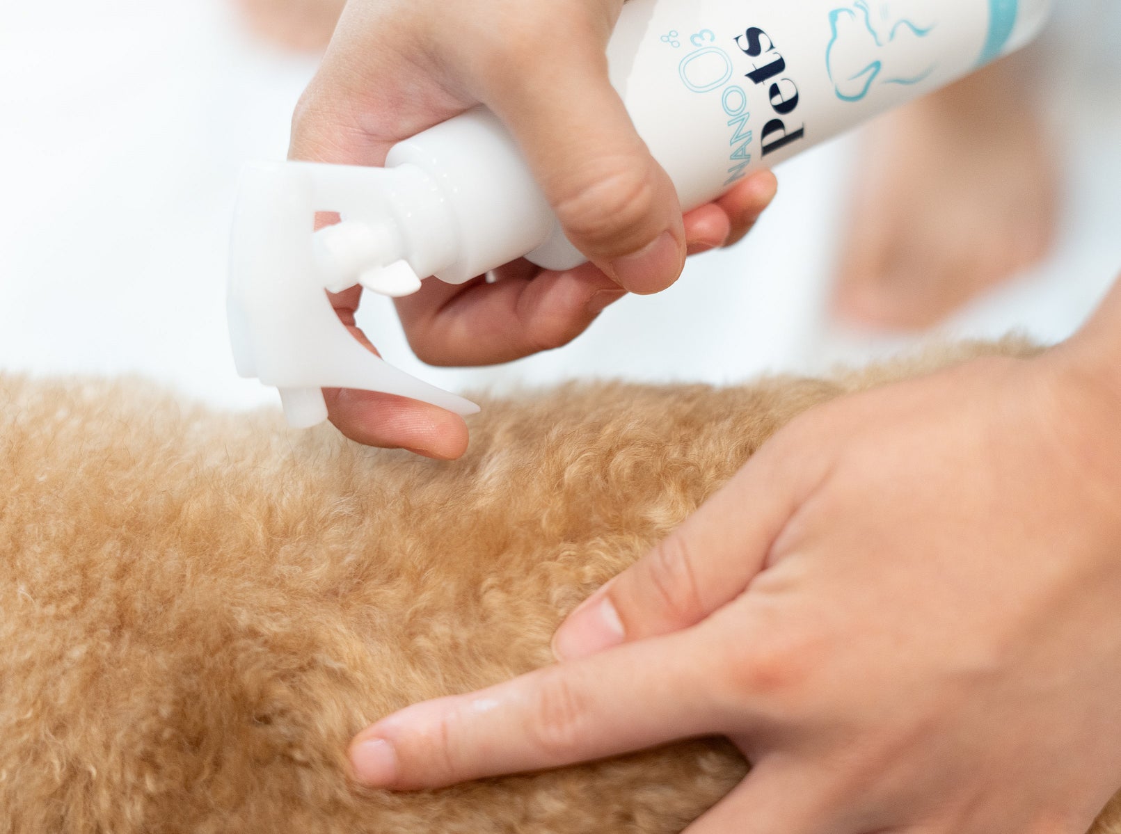 ナノオゾンペッツはスプレータイプの皮ふ・粘膜・炎症ケア用品です。人間用としても効果が実証されている【オゾンナノバブル水】が使用されています。使い方は簡単。菌やウイルスが気になる部位に噴霧するだけです。直接噴霧が難しい場合は、清潔な脱脂綿・綿棒・ 口腔ケア用指サックなどに含ませて対象部位を拭うだけでもOKです。