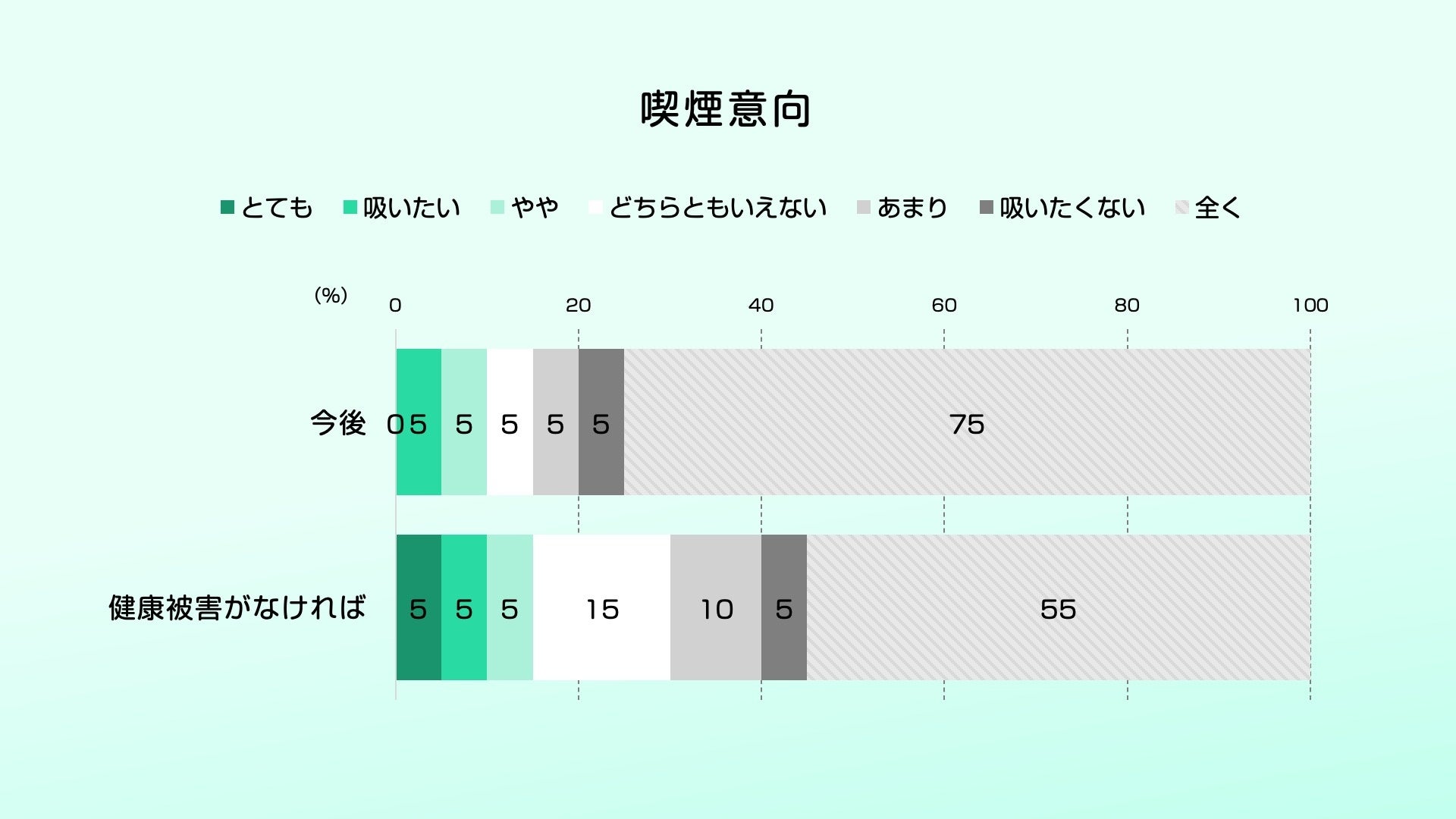 健康被害が無いと仮定すると「全く吸いたくない」と喫煙に対して強い拒否反応を示す回答が減り、「吸いたい」という回答が増加しています。