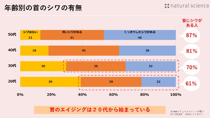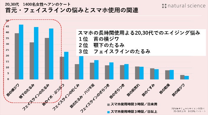 近年スマホやパソコンを長時間見ることでも引き起こる「ストレートネック」も首のしわやたるみの原因にもなるなど首への悩みは、20代から増えていることが弊社の調査で明らかになりました。※1)