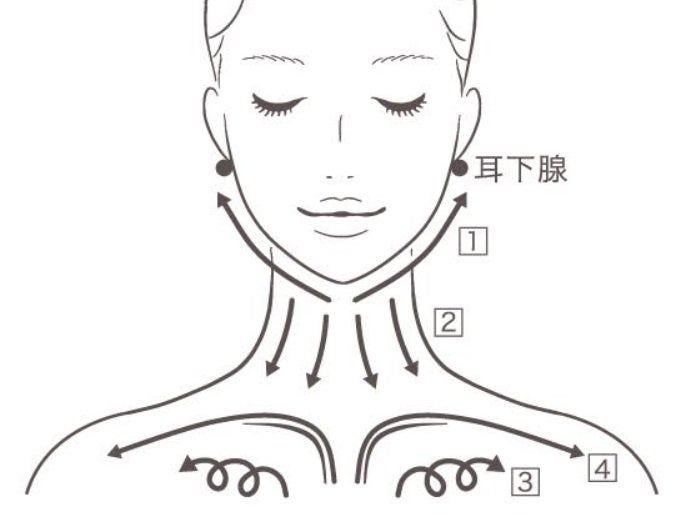1:あご先からフェイスラインまで引き上げ、耳下腺を軽くプッシュ。