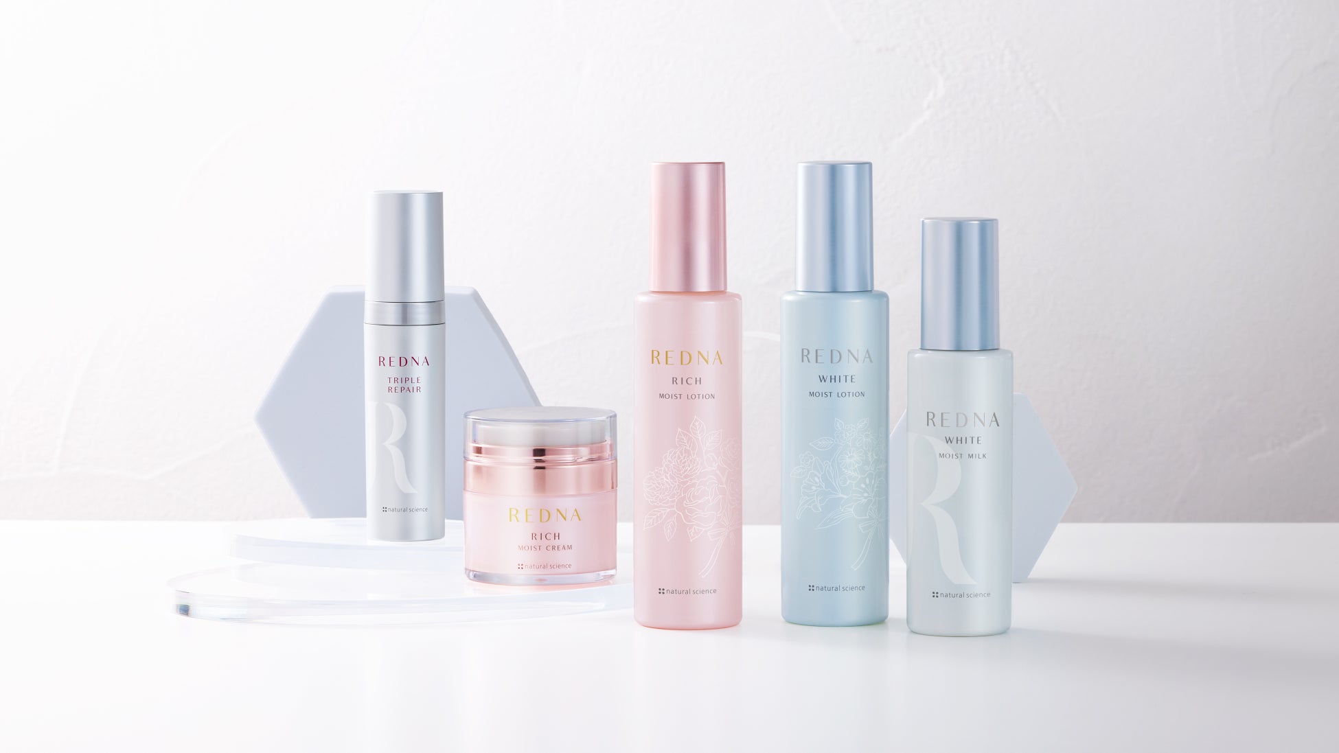 「REDNA(レドナ)」とは、”Return(巻き戻す)+DNA(細胞の遺伝子)”の意味。長年デリケートな肌と向き合い続けて、肌のゆらぎに悩む多くの女性や子どもたちを支えてきた「ナチュラルサイエンス」から、2004年に誕生した大人の敏感肌のためのエイジングスキンケアラインです。