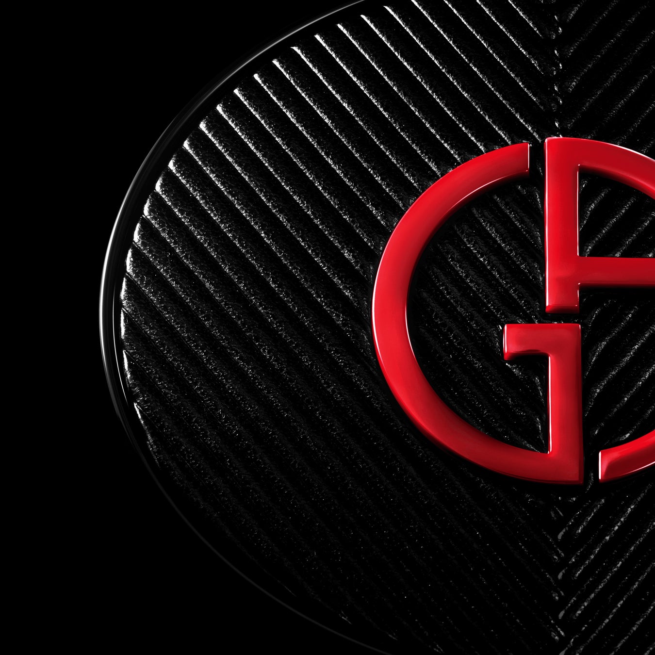 光沢のあるブラックのケースには、コントラストカラーのレッドでジョルジオ アルマーニのモノグラムがあしらわれ、小さなシルバーのモノグラムがキャッチを飾っています。