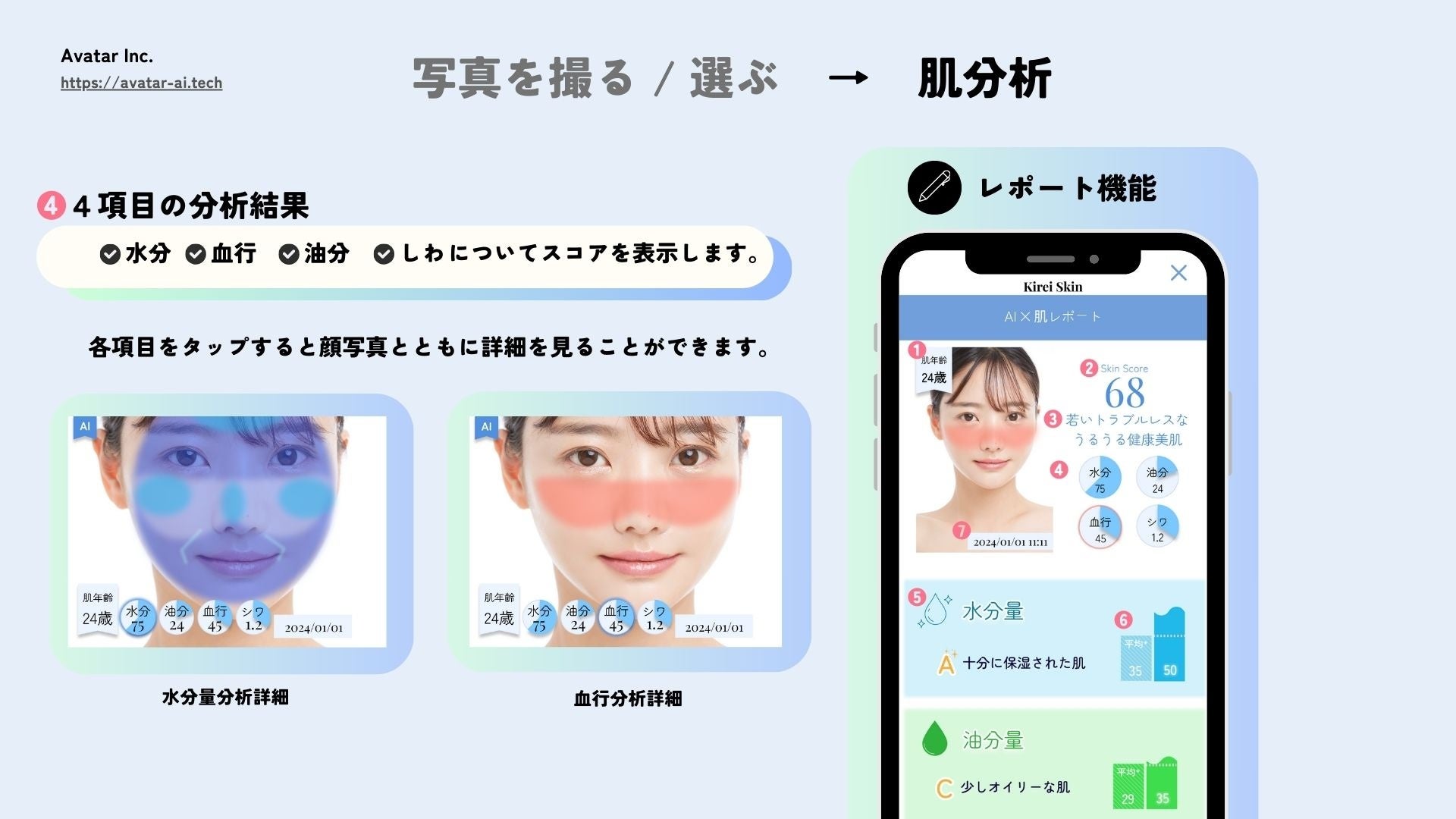 その場で撮影した写真、または過去にアプリで撮影した写真から肌状態をAI分析できます。肌年齢・水分,血行,油分,しわの分析など、写真を撮るだけで簡単に肌の状態を知ることができます。他にもお肌の状態をわかりやすく表す総評・SkinScoreなどで今の肌の状態を知り、記録することができます。