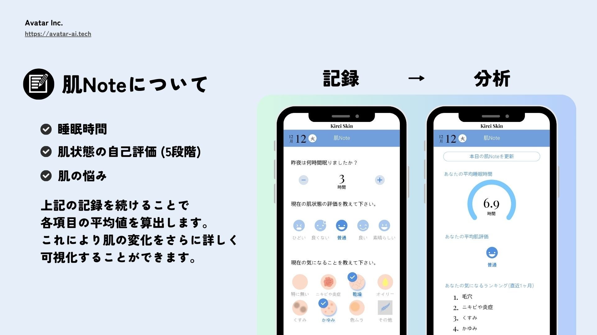 また、睡眠時間や肌の悩み記録することで肌の傾向分析ができます。記録を続ければ肌の変化をさらに詳しく可視化できます。