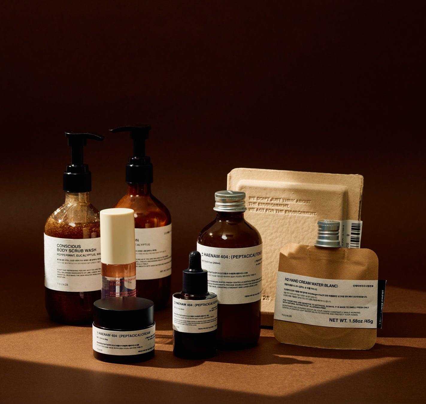 空き容器をリサイクルした什器で彩る店装に新ブランド・限定アイテムを取り揃え、オーガニックビューティーをさらに楽しむ店舗に。