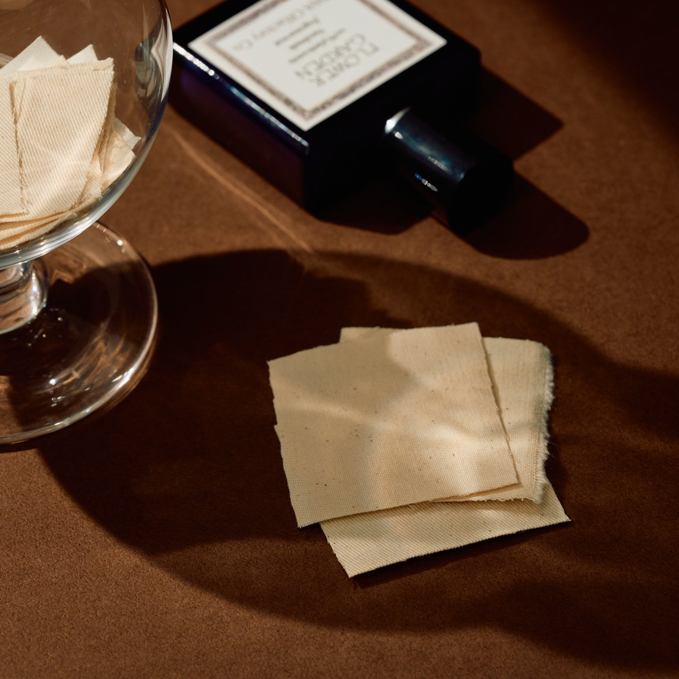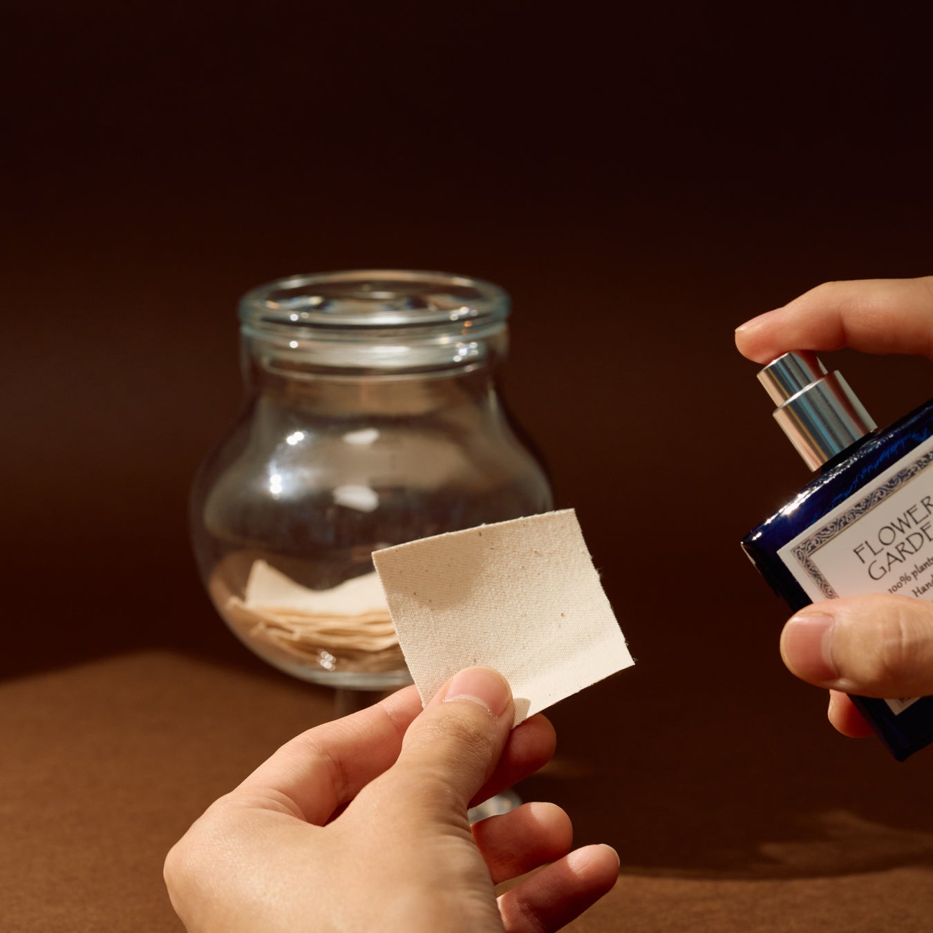 衣類や服飾雑貨を製造する縫製工場で廃棄予定だった端切れを、フレグランスアイテムの香りを試すためのムエットとして活用。洋服や雑貨にはしづらいサイズの生地も、ムエットとして活用すれば紙製のものよりも香りが持続しやすく、心地よい香りを長く楽しむできます。