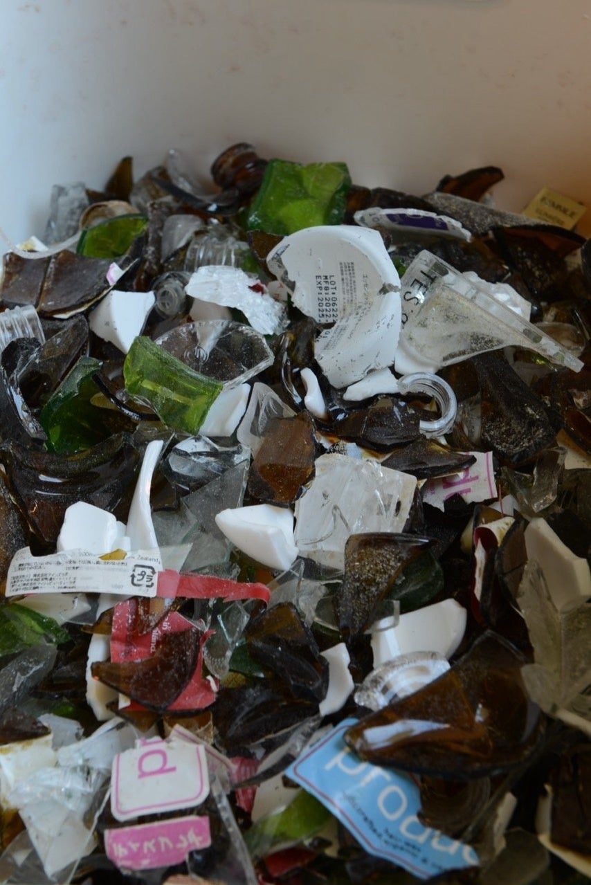 ショッパーや化粧品の空き容器を什器に活用。役目を終えたものを活用することで、より循環型の店舗へと生まれ変わりました。このリサイクル什器はAtelier matic 外山翔さんがデザイン。