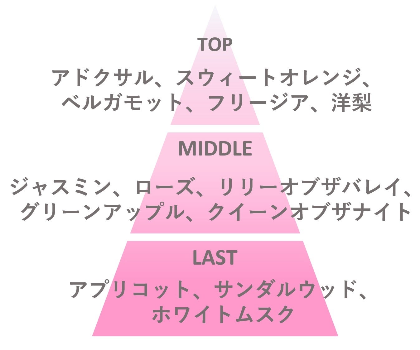 フレッシュなオレンジやベルガモット、甘い洋梨などがアドクサルの引き締まった香りで気分を高揚させるトップノートとなっています。そして優しい甘さのフルーツや花々が重なり、“夜の女王”の名を持つ月下美人の濃厚な香気に包み込まれセクシーな気分を演出するミドルノートへと続きます。ラストノートには落ち着いた甘さのアプリコット、サンダルウッド、ムスクが優しく残ります。