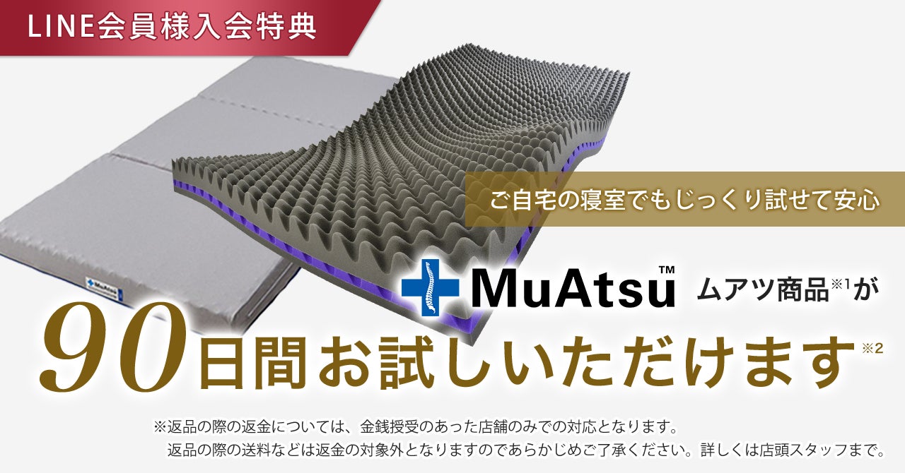 そこで、より多くの皆様にMuAtsuの魅力をご体感いただくため、この度「90日お試しできる返品保証サービス」を将来的に全国67の直営店舗でも展開することを見据え、店舗限定にて試行開始を決定いたしました。