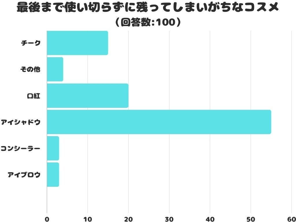 最後まで使い切らずに残ってしまいがちなコスメをアンケートにて調査したところ、1位は「アイシャドウ」でした。