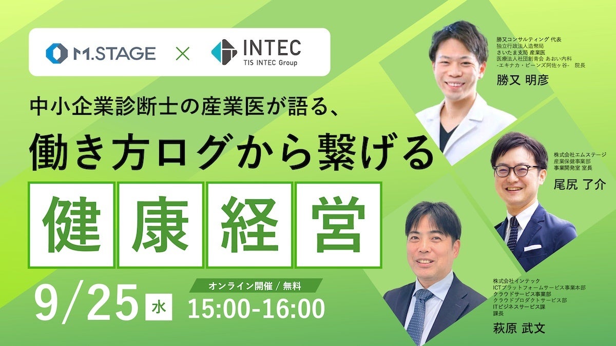 【エムステージ×インテック共催】中小企業診断士の産業医が語る、働き方ログから繋げる健康経営 9/25(水)15時~開催