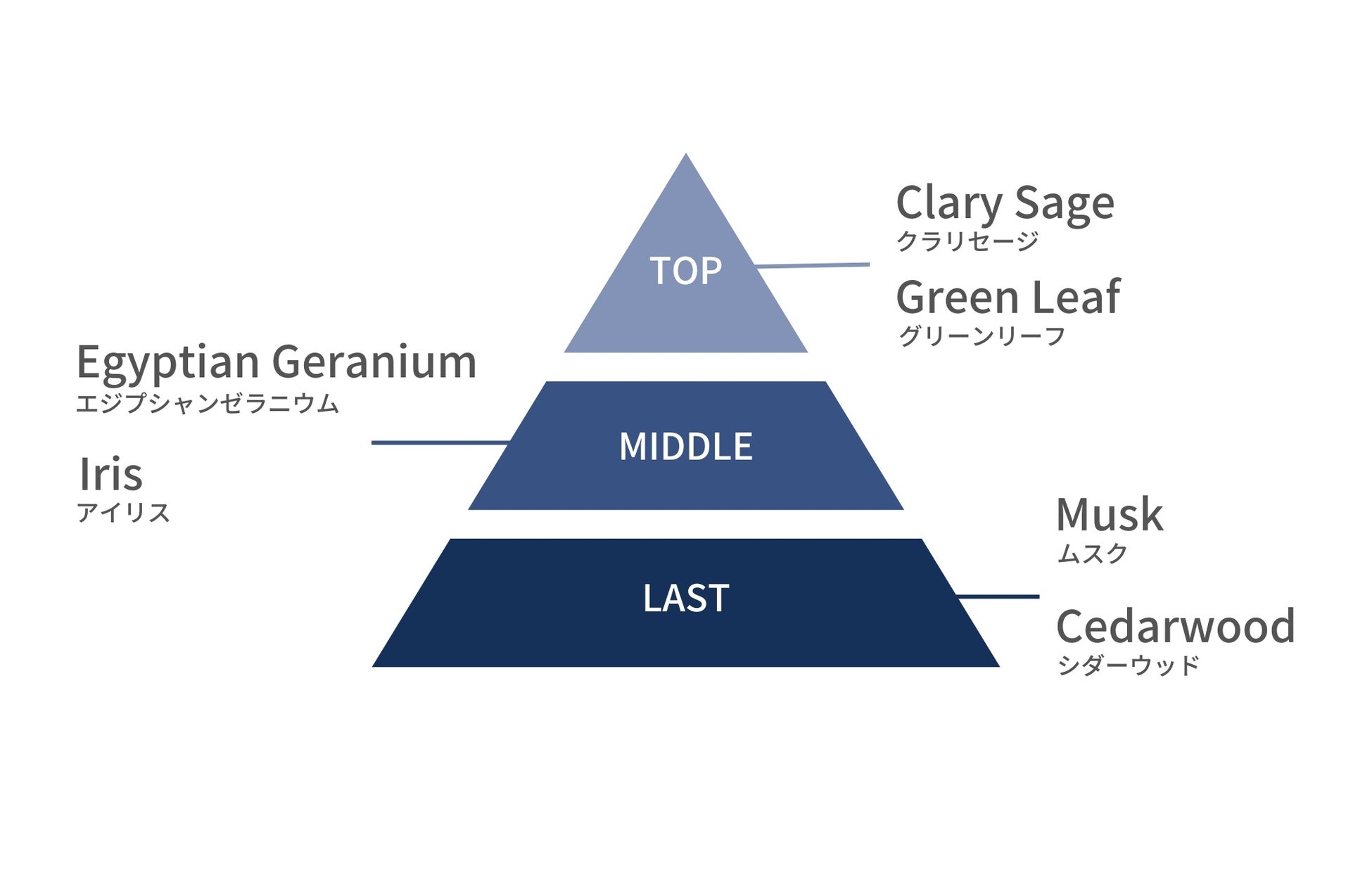 石鹸のような清潔感のある“アイリス”と、希少な“エジプシャンゼラニウム”のフローラルノートと、クラリセージのハーバルノートがやさしく重なり、心をそっと解きほぐします。