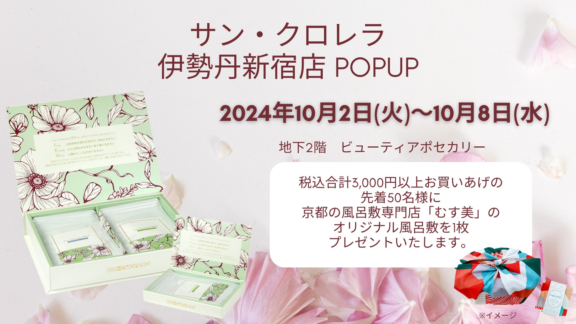 株式会社サン・クロレラ(本社:京都市下京区、代表取締役社長:中山 太、以下「サン・クロレラ」)は、2024年10月2日(水)~8日(火)の1週間、伊勢丹新宿店本館地下2階 ビューティアポセカリーにて今年2回目となるポップアップを開催します。フェムケアに着目した商品を中心に、肌の潤いを保つ機能性表示食品やクロレラ入りソイプロテインなど、特に20~50代女性におすすめの自然派商品をご紹介いたします。