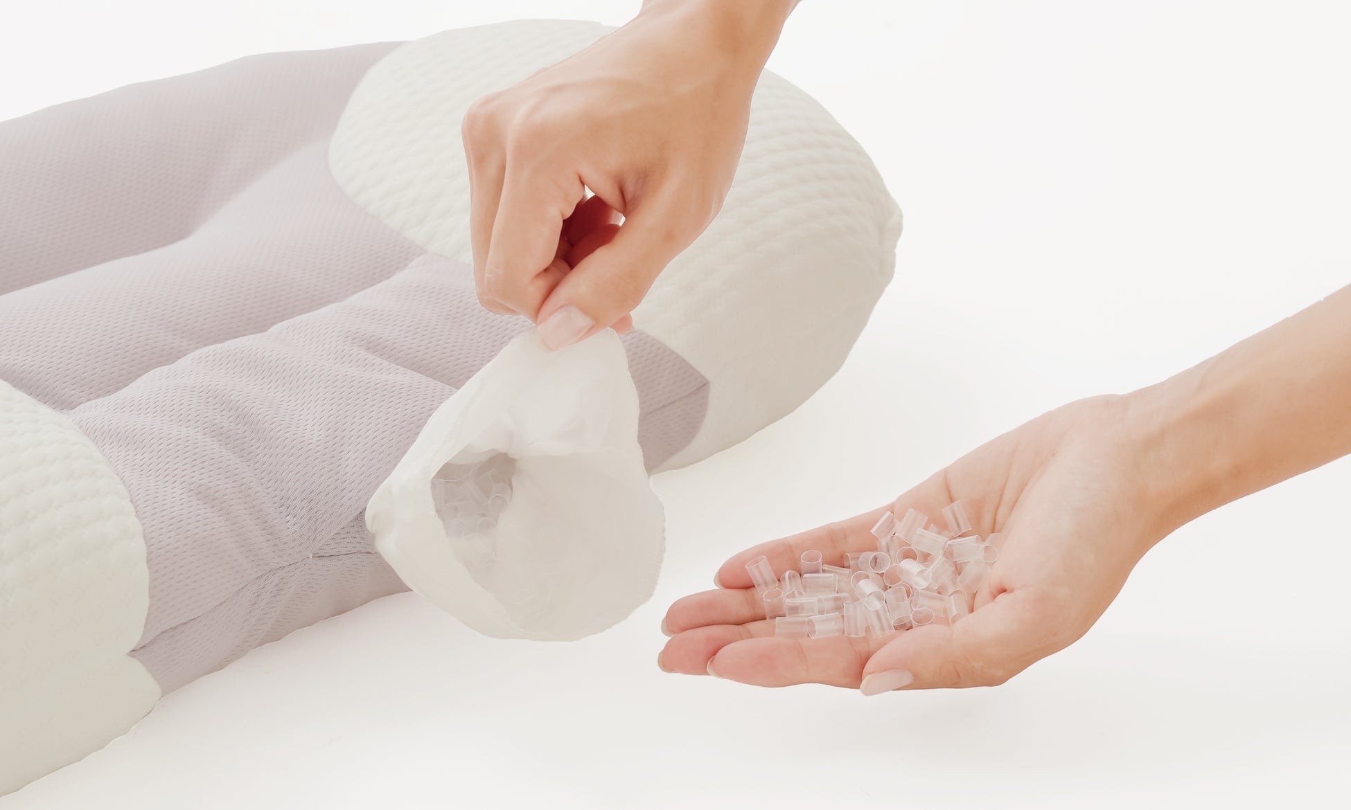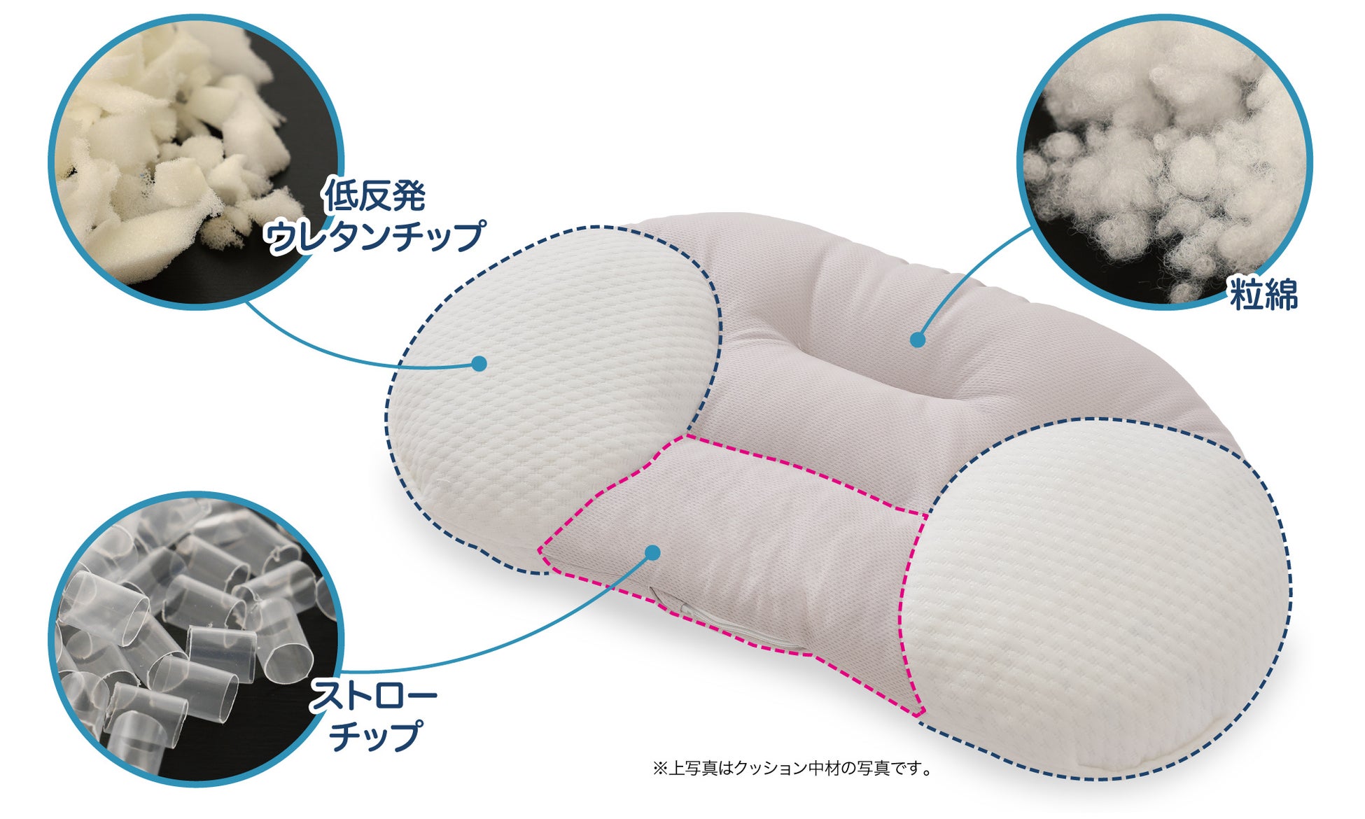 ★頭部はふんわりとした柔らかさの粒綿。頭の形にフィットし、頭の重みをやさしく吸収して包み込まれるような快適さ。