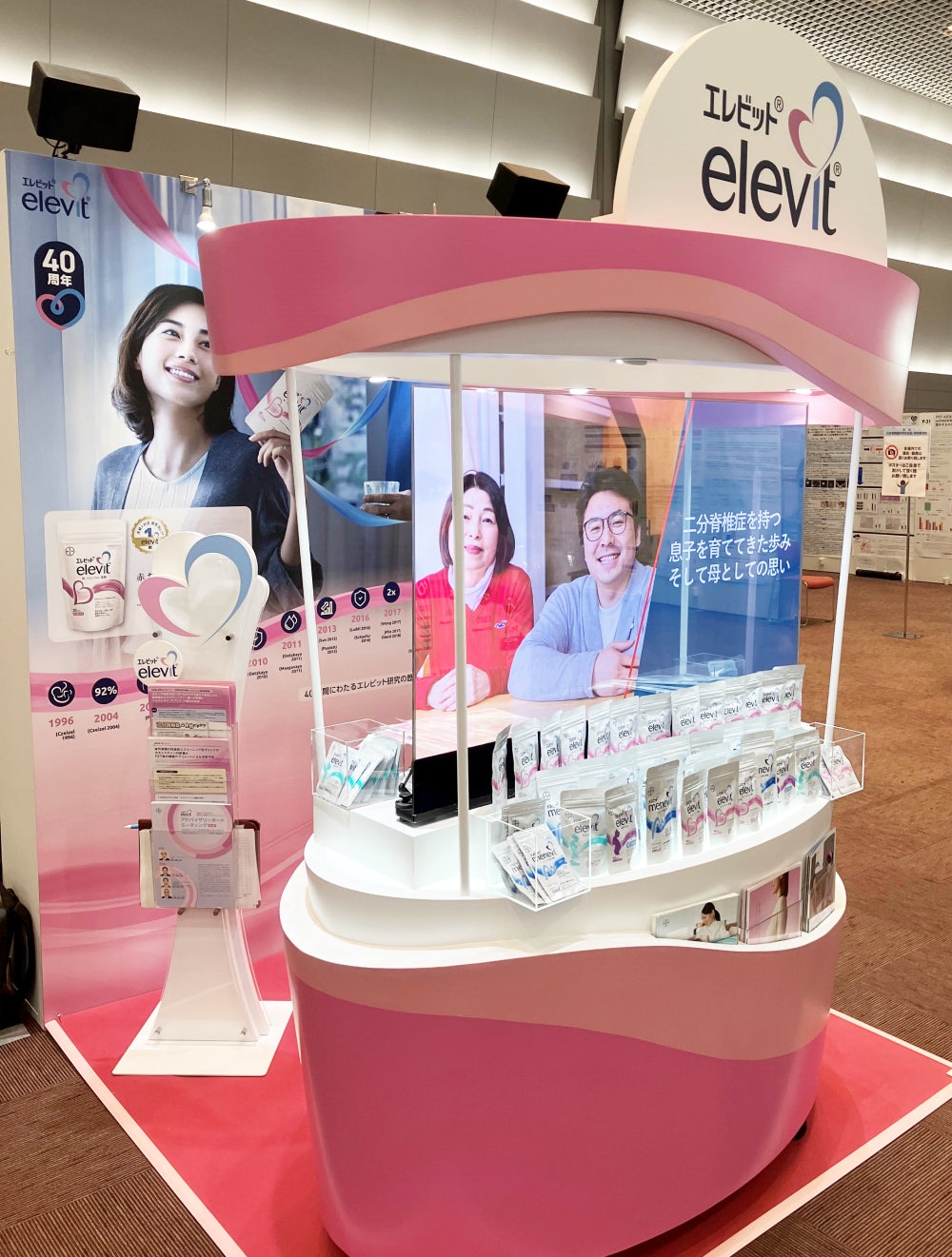 また会場内にエレビット®のブランド・製品展示を実施しました。妊活中~妊娠~産後までの「人生最初の1000日間」に母体と子どもの十分な栄養摂取の必要性を伝えるため、製品エレビット®、メネビット、エレビット®植物性DHA、エレビット®産後ケアについて紹介しました。特に妊活中の女性は赤ちゃんの健康のために、妊娠する前から、前もって十分な葉酸を摂取することが奨められています。