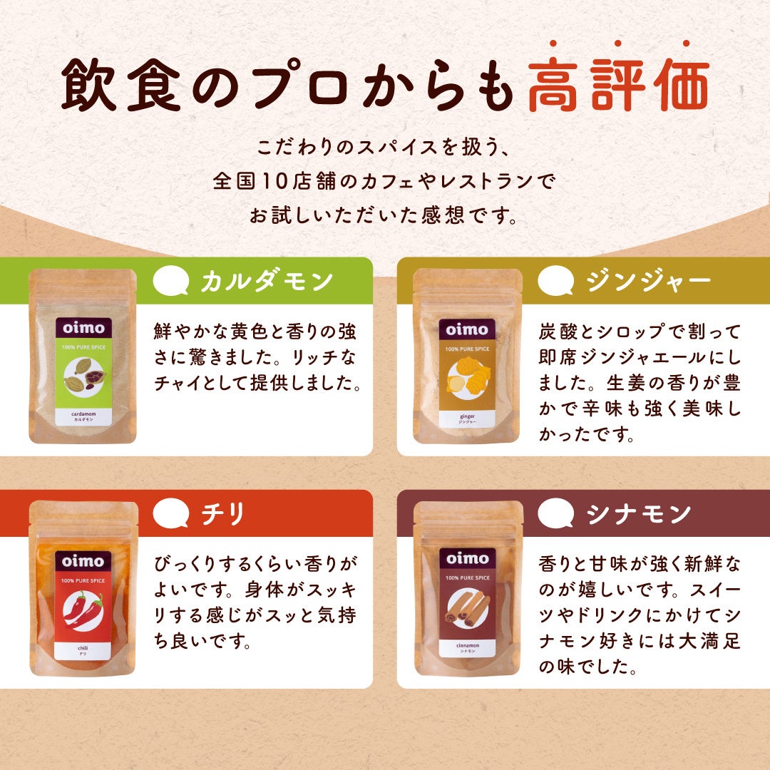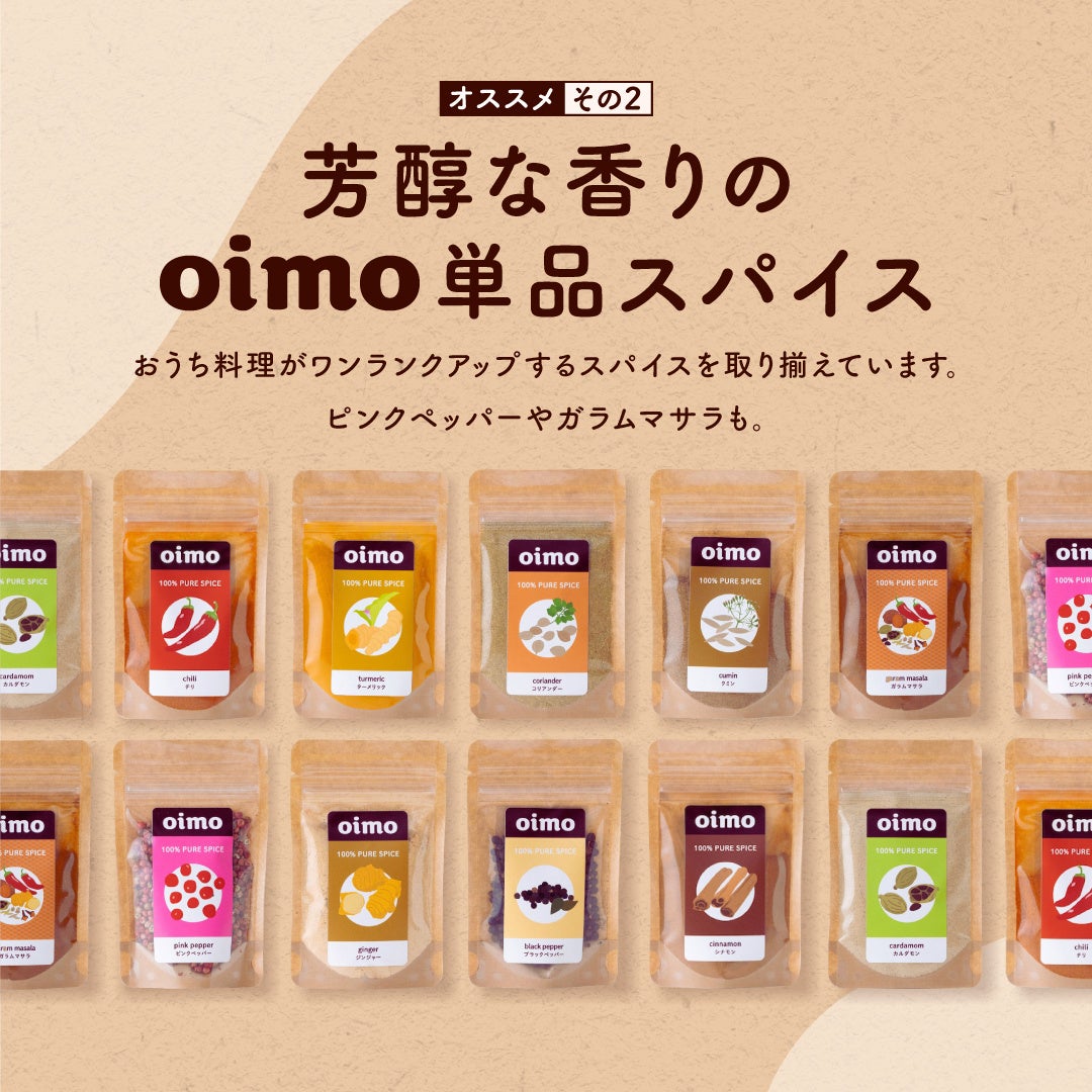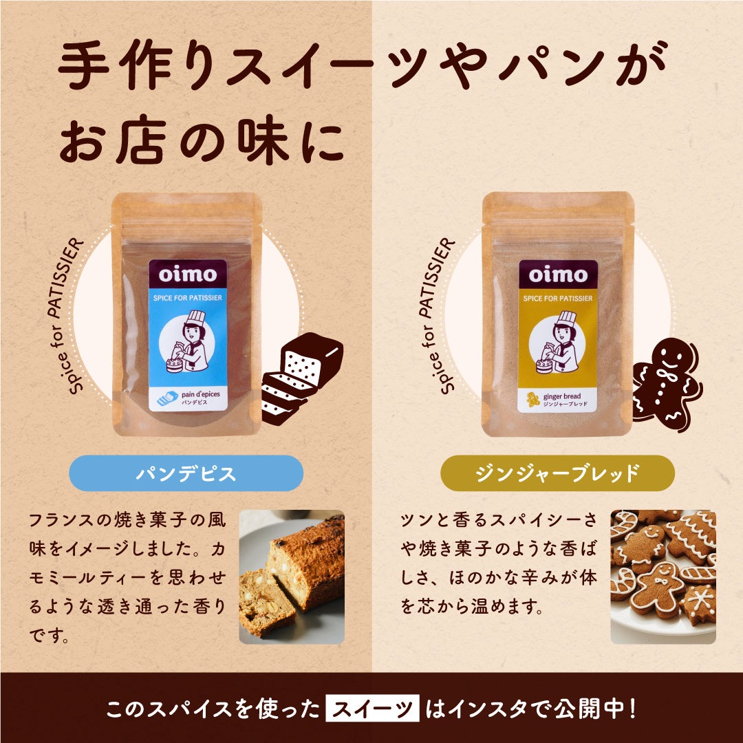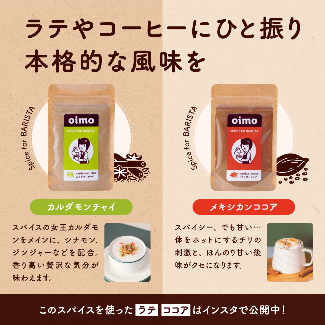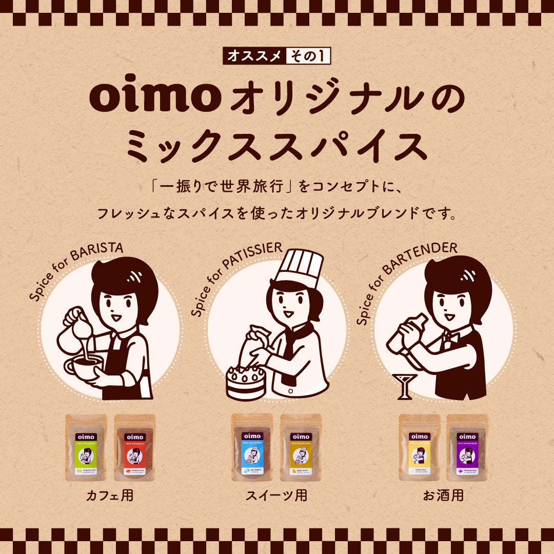 オリジナルミックススパイス・・・「ひと振りで世界旅行」をコンセプトに、いつものコーヒーやラテ、スイーツ、お酒などに豊かな香りを加える、oimoオリジナルブレンド。イギリス、フランス、インドなど各国で親しまれてきた香りが手軽に楽しめます。また、ミックススパイスは製菓、製パン材料にも使えます。