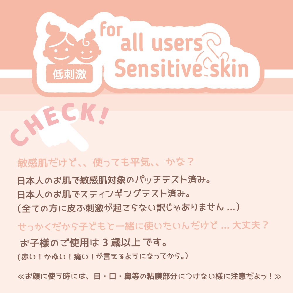 お子様のご使用は3歳以上から。敏感肌の方にもお使いいただけますが、ご使用前にご自身のお肌でパッチテストは行いましょお!