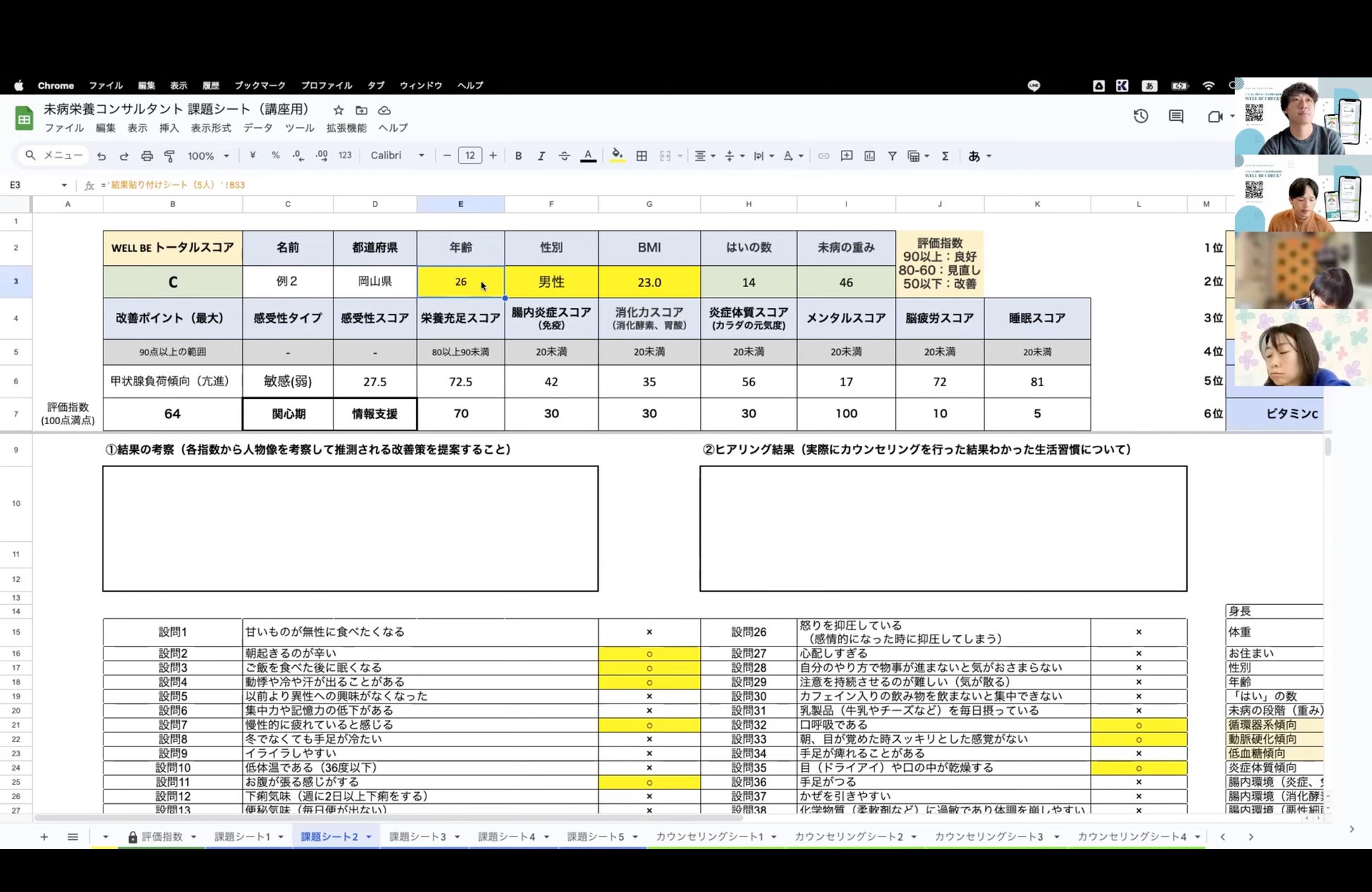 そして、学んだ知識をきちんとアウトプットできるように実践編でWELL BE CHECKを活用したカウンセリング法を学びます。WELL BE CHECKのデータを分析することで、対象者の栄養状態だけではなく、睡眠習慣、ストレス習慣、性格やライフスタイル、そして心の状態まで考察することが可能になります。生活習慣というのは、まさに人生そのものであるということが実感できるはずです。対象者の人生の背景をイメージしながら、根っこにある本質的な健康課題を見つけていくことができるのです。