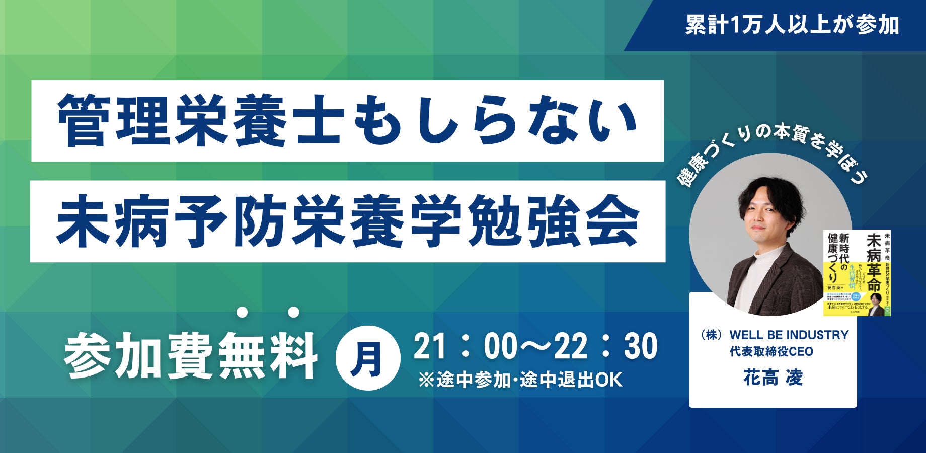 分子栄養学や、未病の基本について学べる累計1万人以上が参加した無料勉強会です。医療従事者を中心に毎週たくさんの方にご参加いただいております。まずはこちらの勉強会に参加いただくことをお勧めしております。
