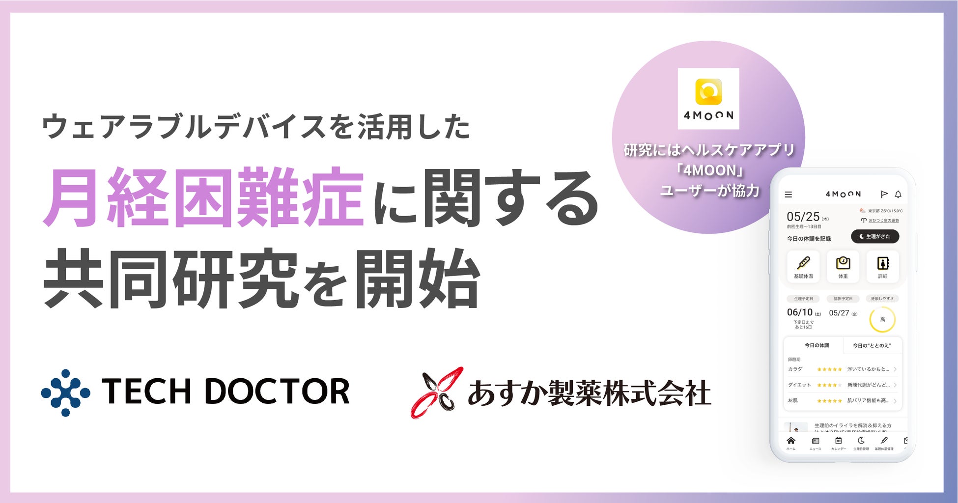 パフォーマンスマーケティング事業・メディア事業の株式会社インタースペース(所在地:東京都新宿区、代表取締役社長:河端伸一郎、証券コード:2122)のグループ会社である4MEEE株式会社(所在地:東京都新宿区、代表取締役:尾久一也)が運営するヘルスケアアプリ『4MOON(フォームーン)』は、株式会社テックドクター(代表取締役:湊和修、本社:東京都中央区、以下、テックドクター)と、あすか製薬株式会社(代表取締役:山口惣大、本社:東京都港区、以下、あすか製薬)との共同研究に協力しました。