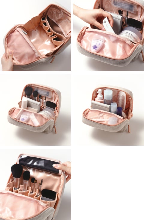 機能性を追求したポーチは正面部分が折りたたみ可能でブラシポケットやメッシュポーチなど収納もたっぷり。