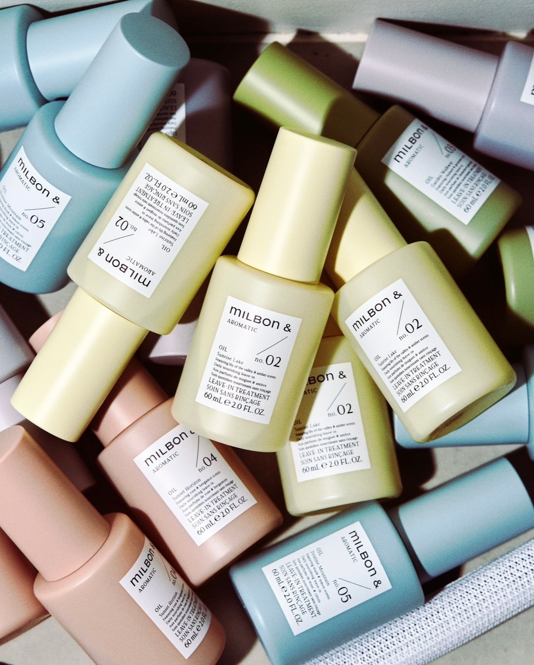 楽しみながら香りを選べるヘアケア “milbon & Aromatic”は、心躍るヘアケアの第一歩となる「シャンプー」1種と、日々変化する自分の気持ちや感性に合わせて選べる、個性豊かな5種の香りの “トリートメント”と“オイル(洗い流さないトリートメント)”をラインナップ。3種のボタニカルオイル※の配合バランスで保湿感、指通り、まとまりを高め幅広い髪質に対応します。