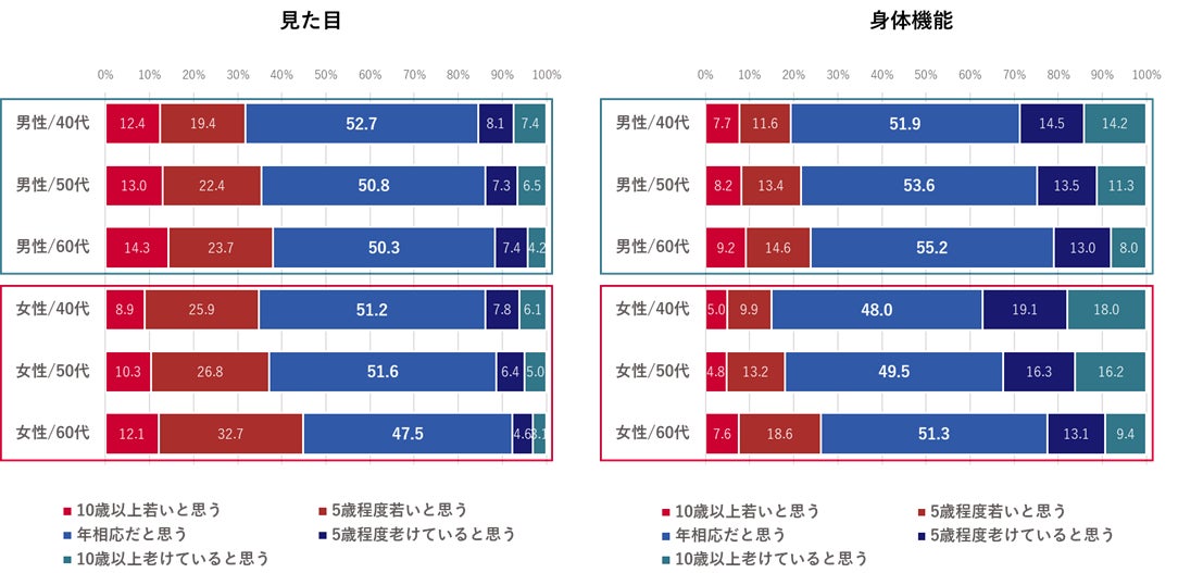 【実年齢と比べて、自身の見た目が若いと思っている人は約4割、身体機能が若いと思っている人は約2割】