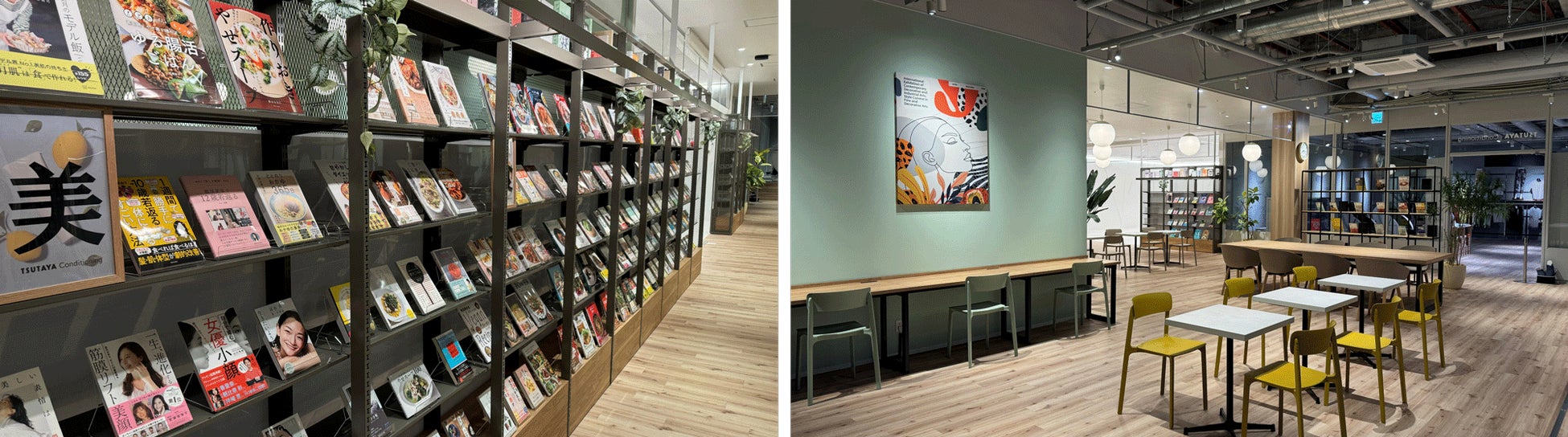 運動の合間には、運動・美・食・暮らしをテーマに『代官山 蔦屋書店』のコンシェルジュが選書した本を約200冊揃えた本棚も備え、レッスンの前後などに読書をお楽しみいただけます。また、タニタカフェには、健康に配慮したコーヒーとフードをご用意しており、コーヒー片手に読書を楽しんでいただくことも可能です。