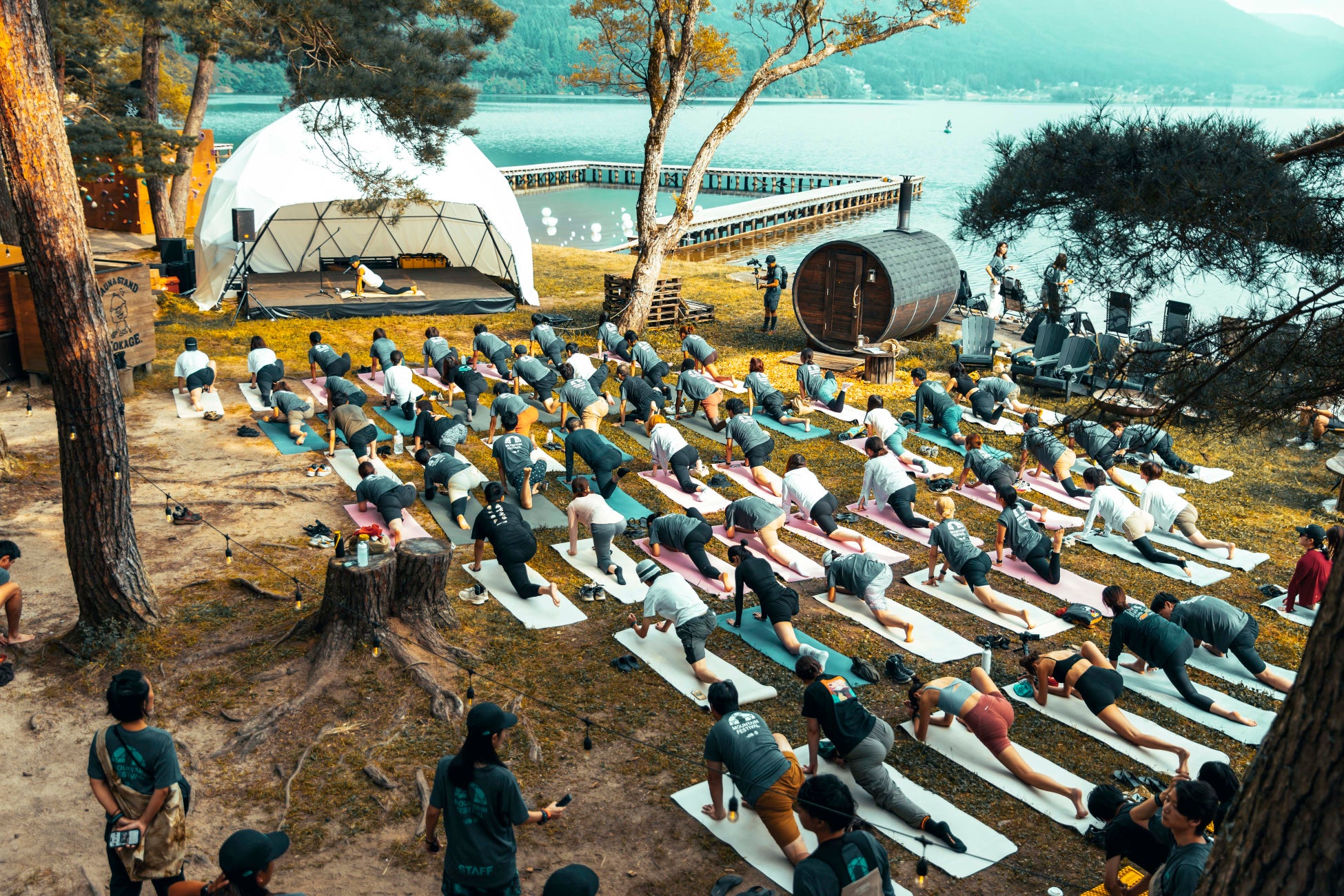 当日は、湖畔の澄んだ空浮の中で行われる朝ヨガパートをIGNITE YOGAのMaster Teacher甲斐 実由希がリードし、たくさんの方にご参加いただきました。