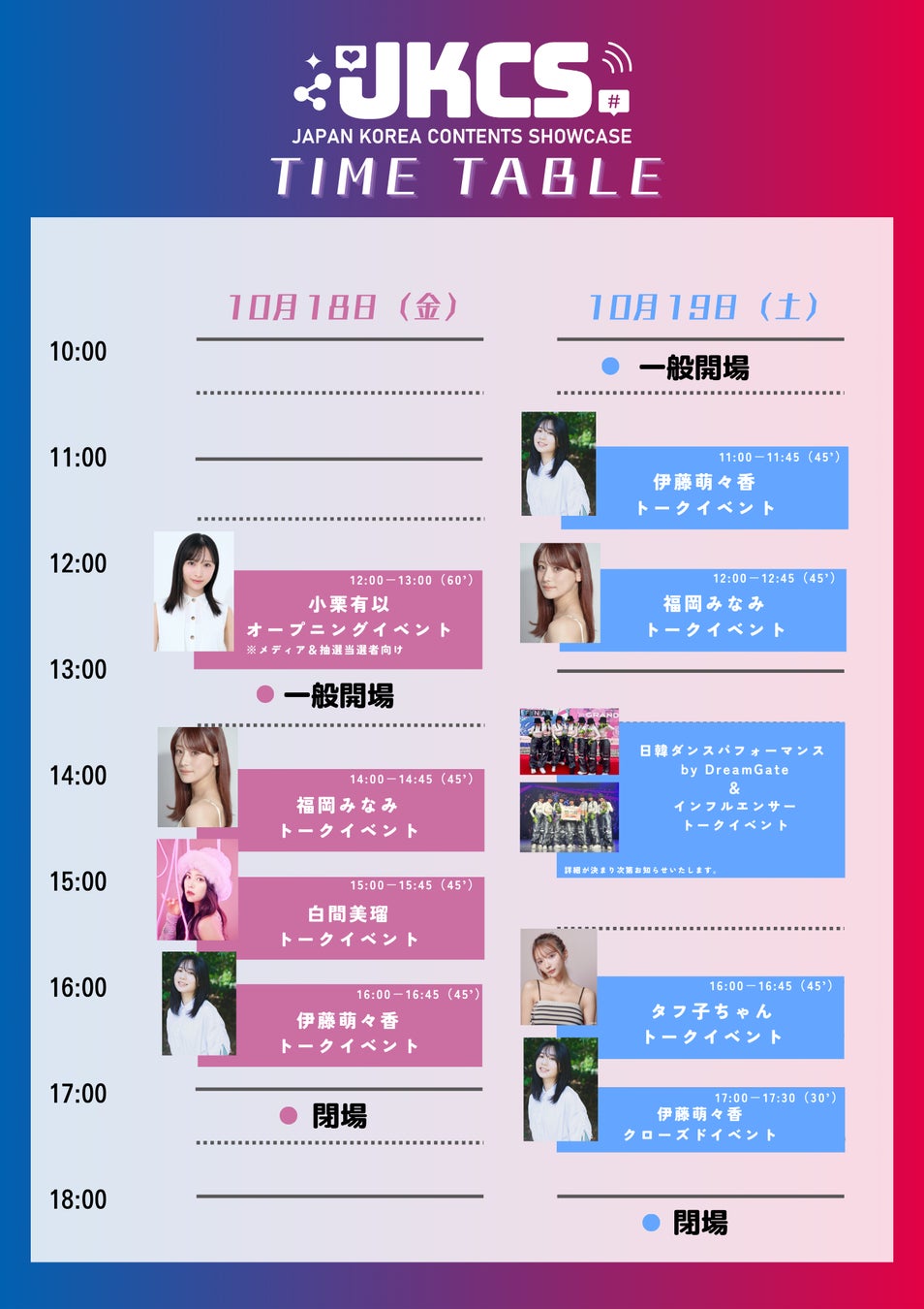 これまで出演発表したAKB48 小栗有以さん、タレント 白間美瑠さん、タレント 福岡みなみさん、女優 伊藤萌々香さんのスペシャルゲスト4名が登場するトークステージを含むJKCS2024タイムテーブルが本日初公開となりました。ステージコンテンツは、一部の来場者限定で招待するオープニングセレモニー含め全10本を予定しており、今回追加でダンスパフォーマンスステージやゲストのタフ子ちゃん、インフルエンサーによるトークステージの開催も決定しました。