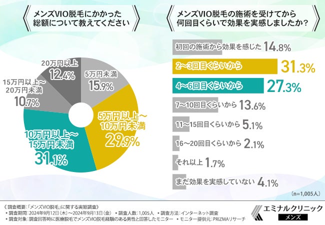 メンズVIO脱毛にかかった費用や、効果を実感した施術回数などが判明しました。