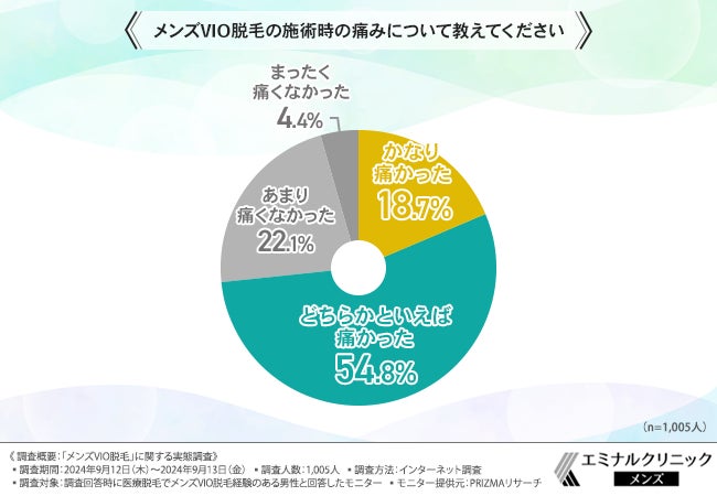 「メンズVIO脱毛の施術時の痛みについて教えてください」と質問したところ、約7割の方が『かなり痛かった(18.7%)』『どちらかといえば痛かった(54.8%)』と回答しました。