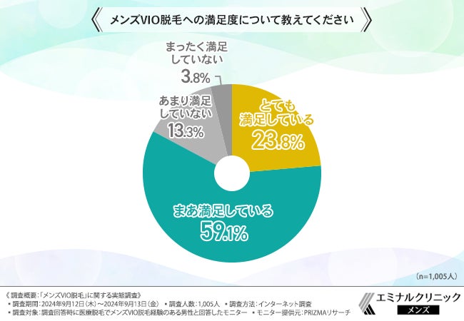 「メンズVIO脱毛への満足度について教えてください」と質問したところ、約8割の方が『とても満足している(23.8%)』『まあ満足している(59.1%)』と回答しました。