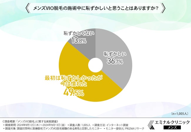 「メンズVIO脱毛の施術中に恥ずかしいと思うことはありますか?」と質問したところ、『恥ずかしい(36.7%)』『最初は恥ずかしかったが今は慣れた(49.5%)』『恥ずかしくない(13.8%)』という回答結果になりました。