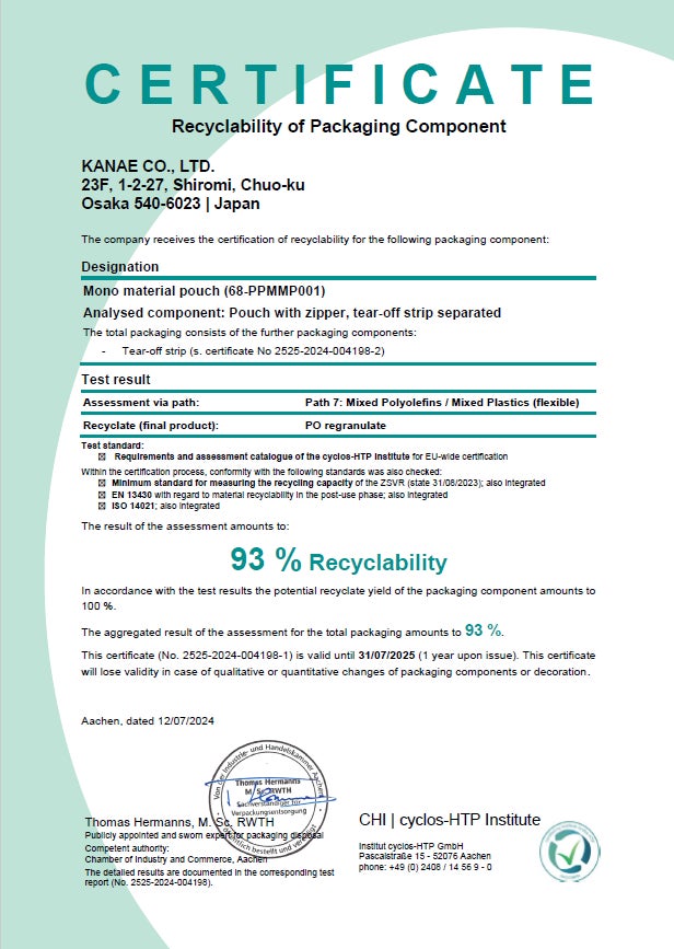 「Institute cyclos-HTP」よりリサイクル適性93%の認証を取得しています。
