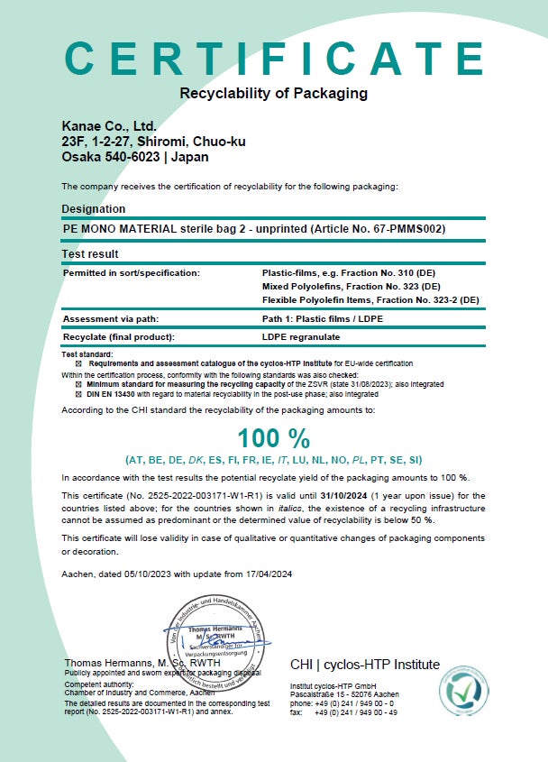 医薬品・食品・化粧品・メディカル分野と、幅広い分野で製品を展開しており、下記主要4製品については全ての製品でドイツに拠点を置く独立研究所「Institute cyclos-HTP」よりリサイクル適性認証を取得しています。