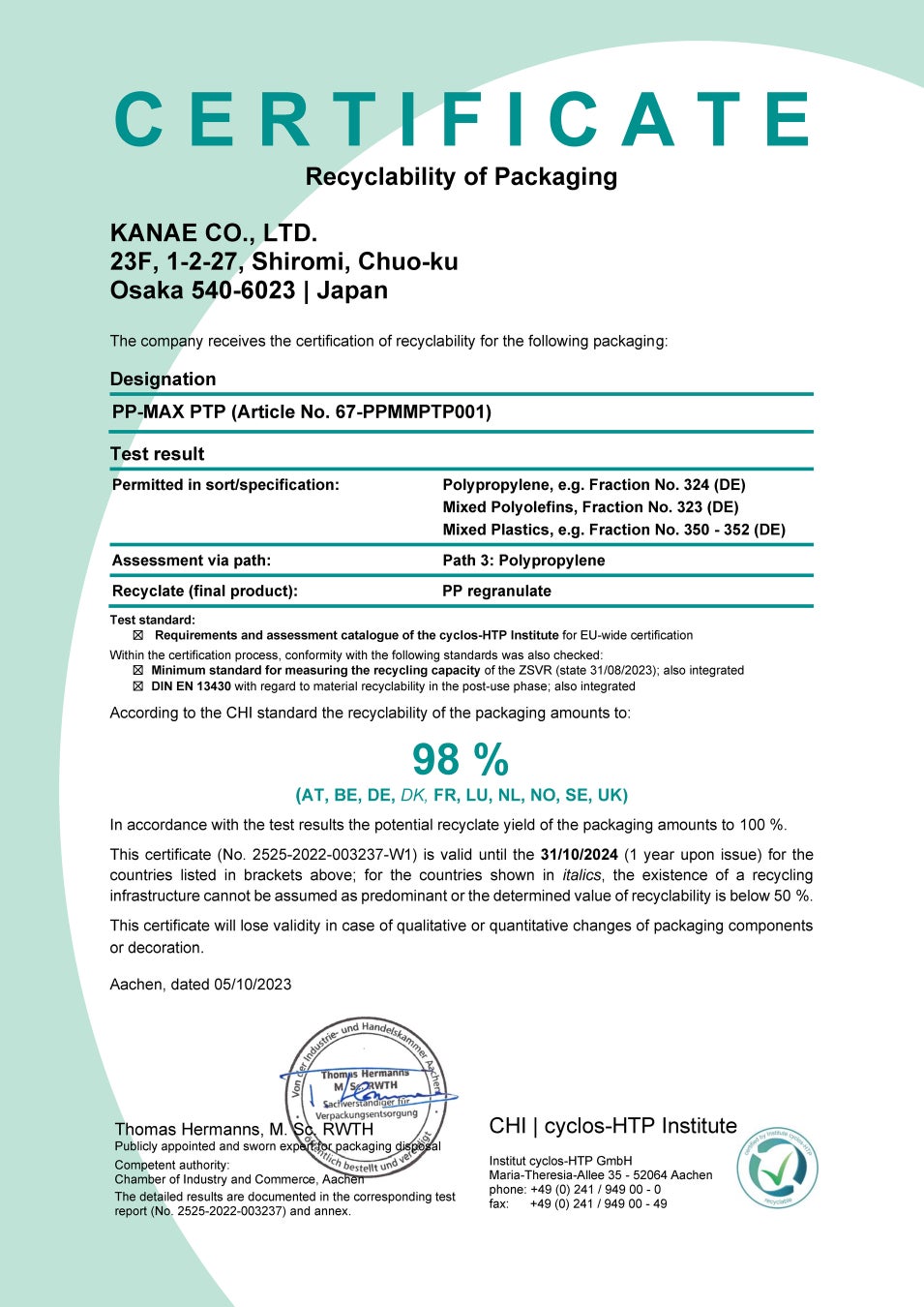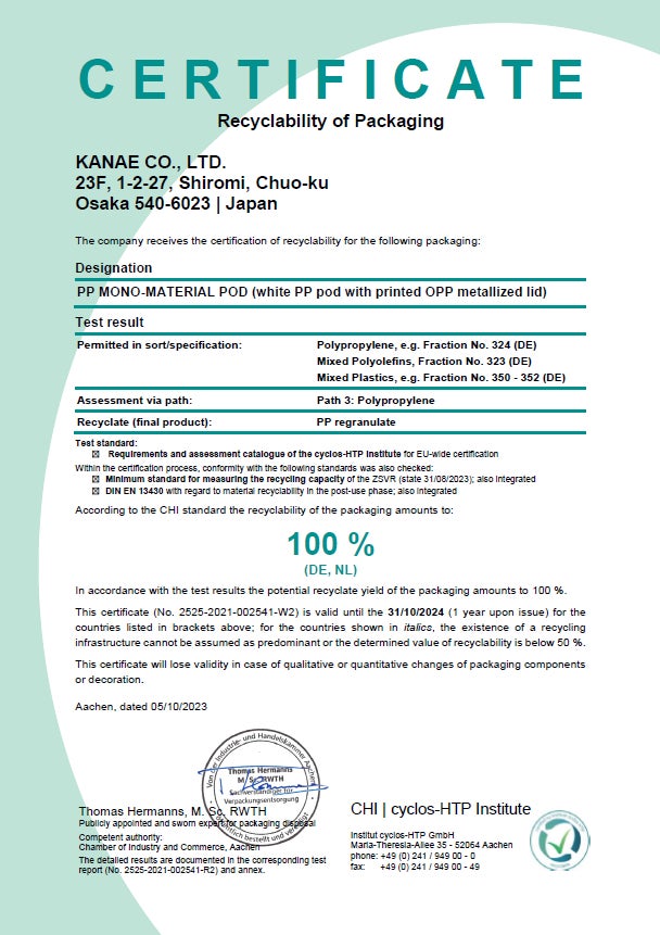 「Institute cyclos-HTP」よりリサイクル適性100%の認証を取得しています。