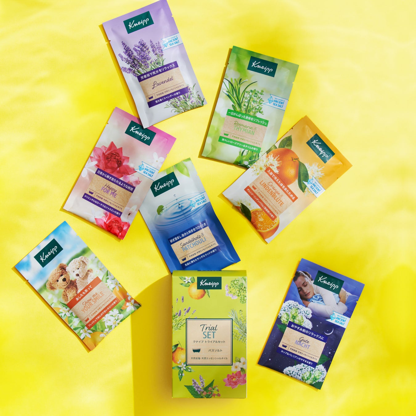 自然の恵みたっぷりの豊かな香りと天然ミネラルが豊富なバスソルトは、いつもの日常に至福の時間をもたらしてくれる、最も身近な贅沢品の一つ。『クナイプ バスソルト トライアルセット』は、気分に合わせて選べる楽しさを感じていただける7種類の香りが入っています。