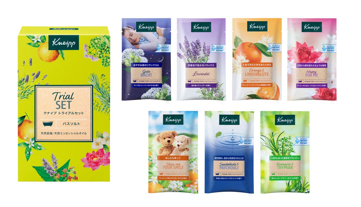 ドイツ生まれのハーバルブランド クナイプ(株式会社クナイプジャパン 本社:神奈川県横浜市、代表取締役社長:大脇明憲)は、「クナイプ バスソルト」のパッケージリニューアル(ボトル、個包装タイプともに)に伴い、新デザインに生まれ変わった「クナイプ バスソルト」個包装タイプ7種類をセットにしたトライアルセットを2024年10月2日(水)より発売します。